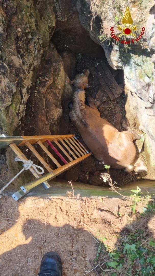 Una volta arrivati sul posto, i Vigili del Fuoco sono entrati nella cavità montana attraverso una scala in legno. Una misura per misurare la profondità di quello strapiombo, ma soprattutto imbracare il cavallo. Operazioni seguite dall’alto da un elicottero dei Vigili del Fuoco, che hanno monitorato l’azione dei colleghi sotto di loro.