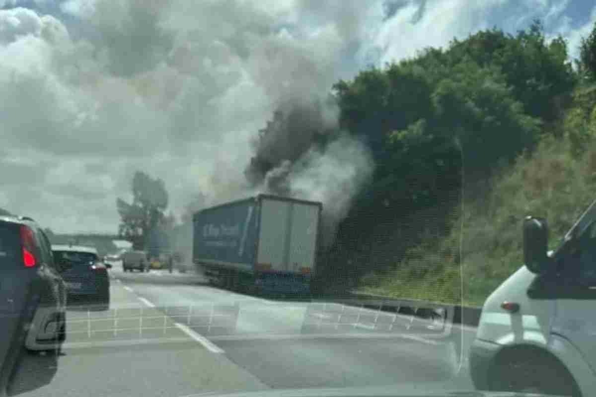 Camion a fuoco sulla Pontina oggi – Foto: Noi pendolari della Pontina (ilcorrieredellacitta.com)