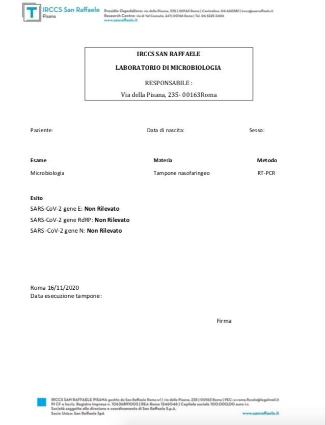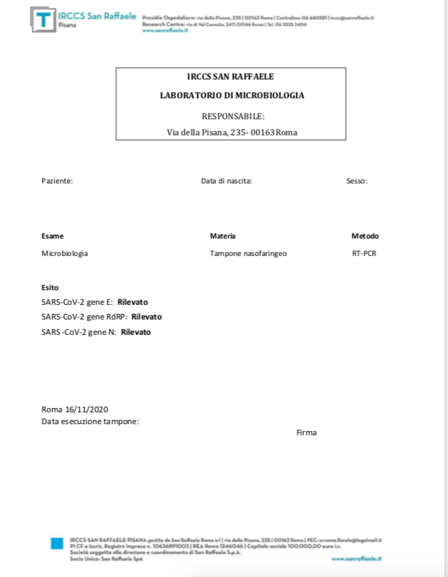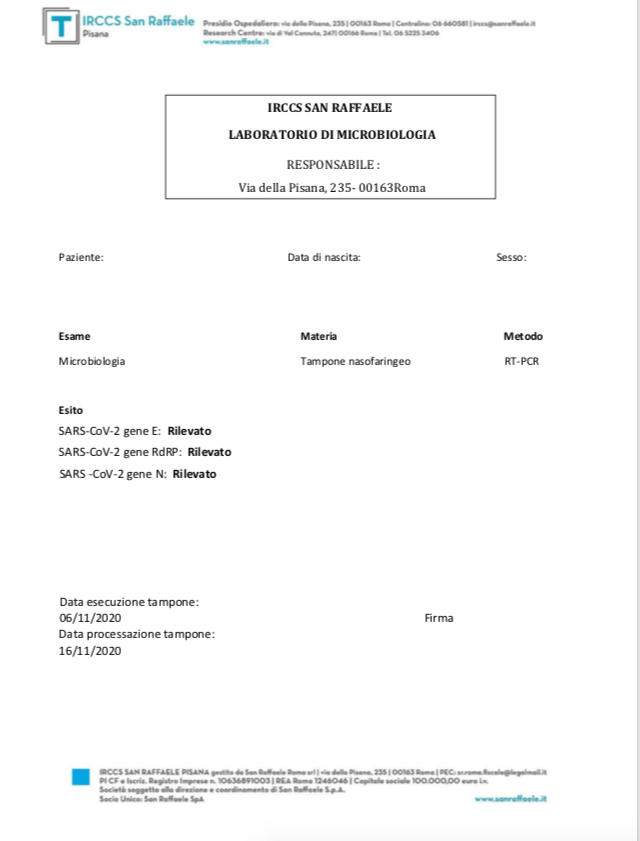 “Oggi chiamando il centro (San Raffaele sulla Pisana) dove hanno eseguito i nostri esami – prosegue il biologo – la dottoressa incaricata di firmare i referti alla nostra richiesta di dirci quando fossero stati eseguite le analisi ci ha confermato che sono state eseguite il 16 Novembre, ovvero 10 giorni dopo l’esecuzione del prelievo. Inoltre sul nostro referto non era presente alcuna data di accettazione ovvero di esecuzione del tampone. Tale data è presente su qualunque referto di qualunque tipo di analisi. In calce al referto c’è scritto “Data esecuzione tampone:” senza alcuna data specificata. Questa mancanza è voluta? La Dottoressa ha asserito che non è specificata in quanto i campioni sono arrivati senza alcuna data di esecuzione. Ulteriore dato sconcertante. Come posso io, direttore responsabile di refertazione, refertare un risultato senza sapere se quel tampone è stato eseguito un giorno prima, un mese prima, 6 mesi prima? Come posso accertare la qualità del dato analitico?”