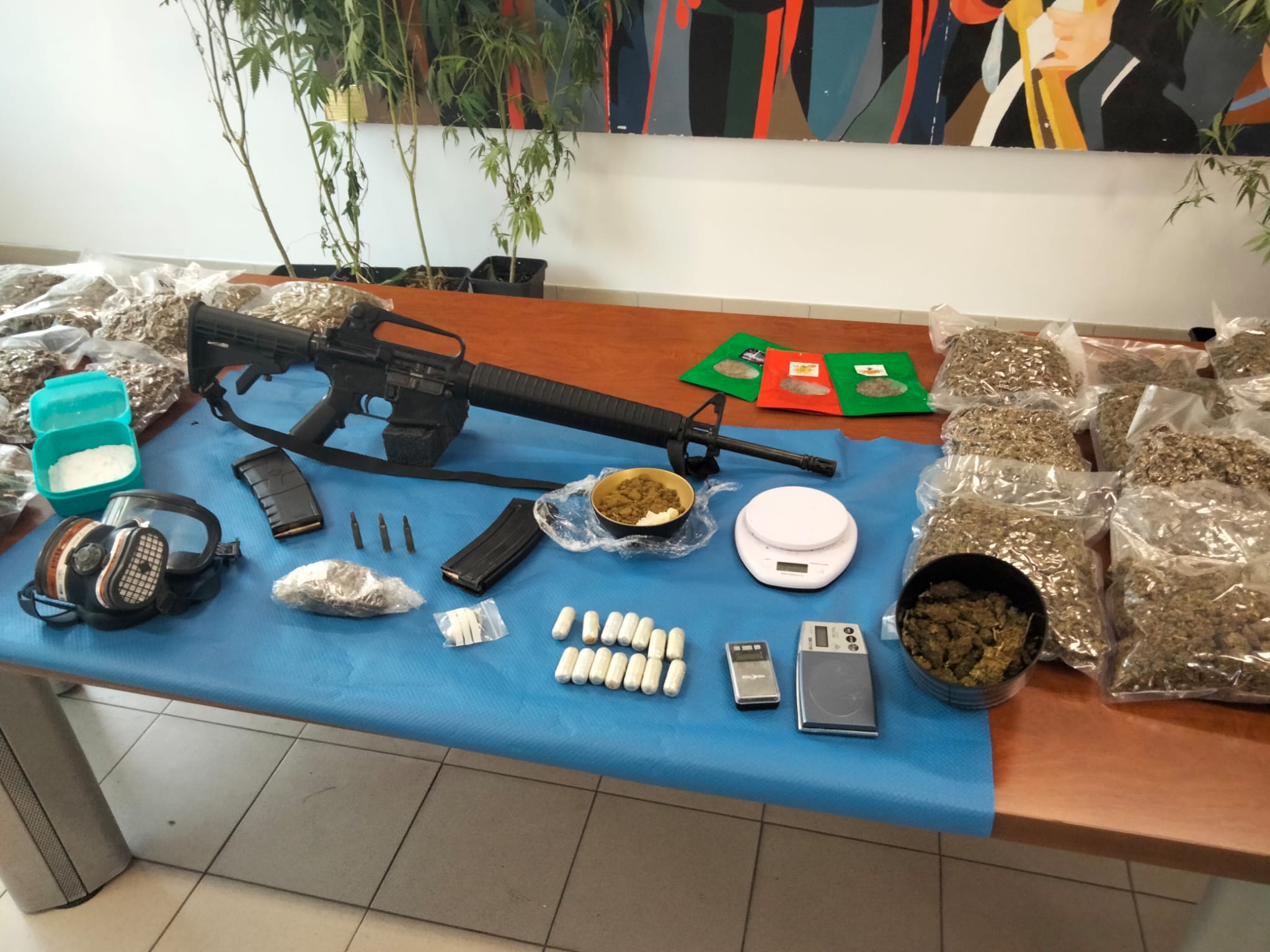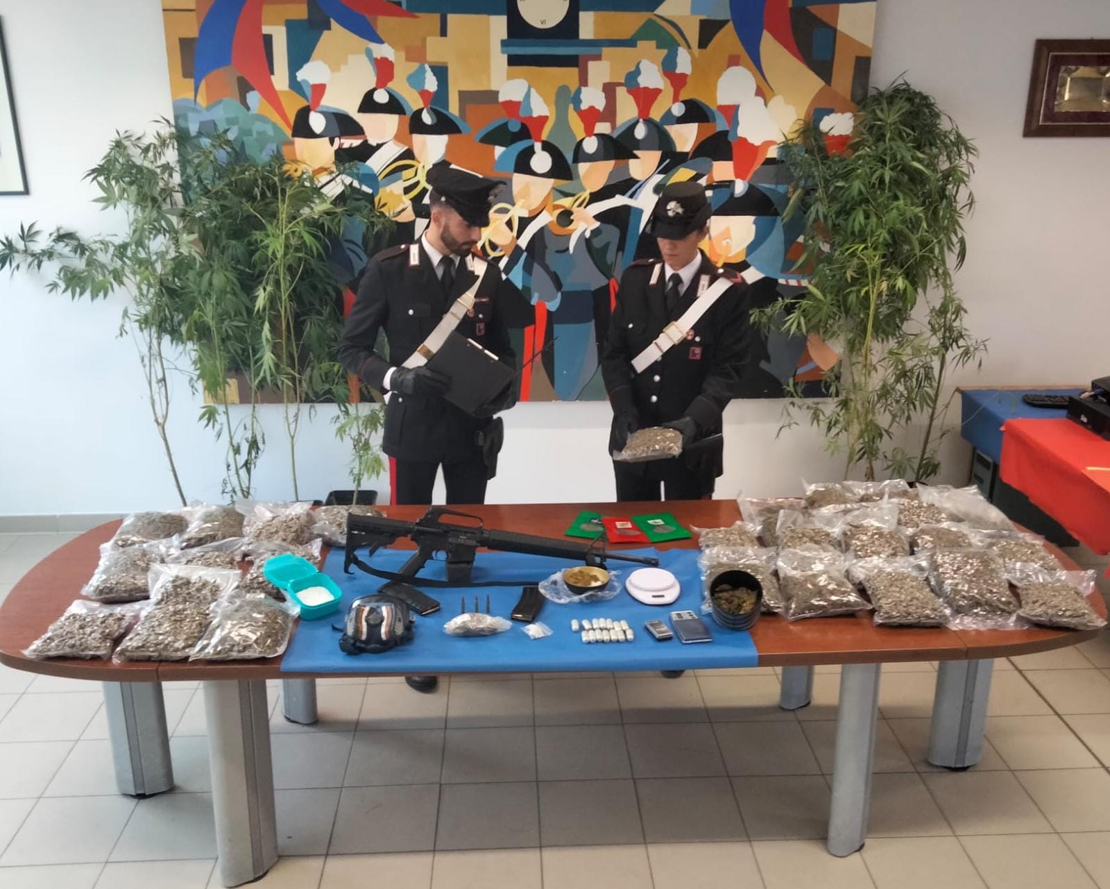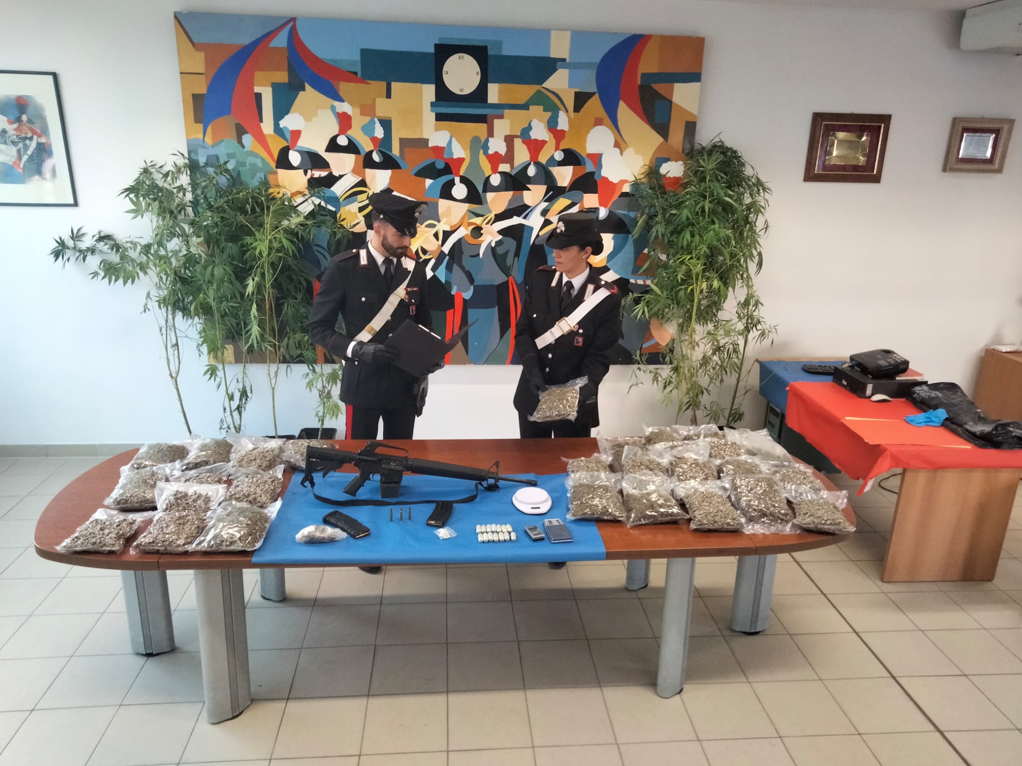 Nella fattispecie, erano 850 le piante di marijuana, di altezza media mt. 2, coltivate in una serra sotterranea con accesso esclusivo tramite botola nascosta da mattonato retrostante l’abitazione, n. 15 involucri per un totale di 175 grammi di cocaina, 35 involucri da 410 grammi circa ognuno per un totale complessivo di 14 kg di marjiuana essiccata, 215 grammi di sostanza stupefacente del tipo hashish ed ancora, 125 grammi di sostanza da taglio in polvere di colore bianco, 3 bilancini elettronici di precisione, materiale per il confezionamento, nonché un fucile marca Ruger AR 15, con matricola abrasa, e due caricatori contenenti complessivamente 48 cartucce calibro 5,56.