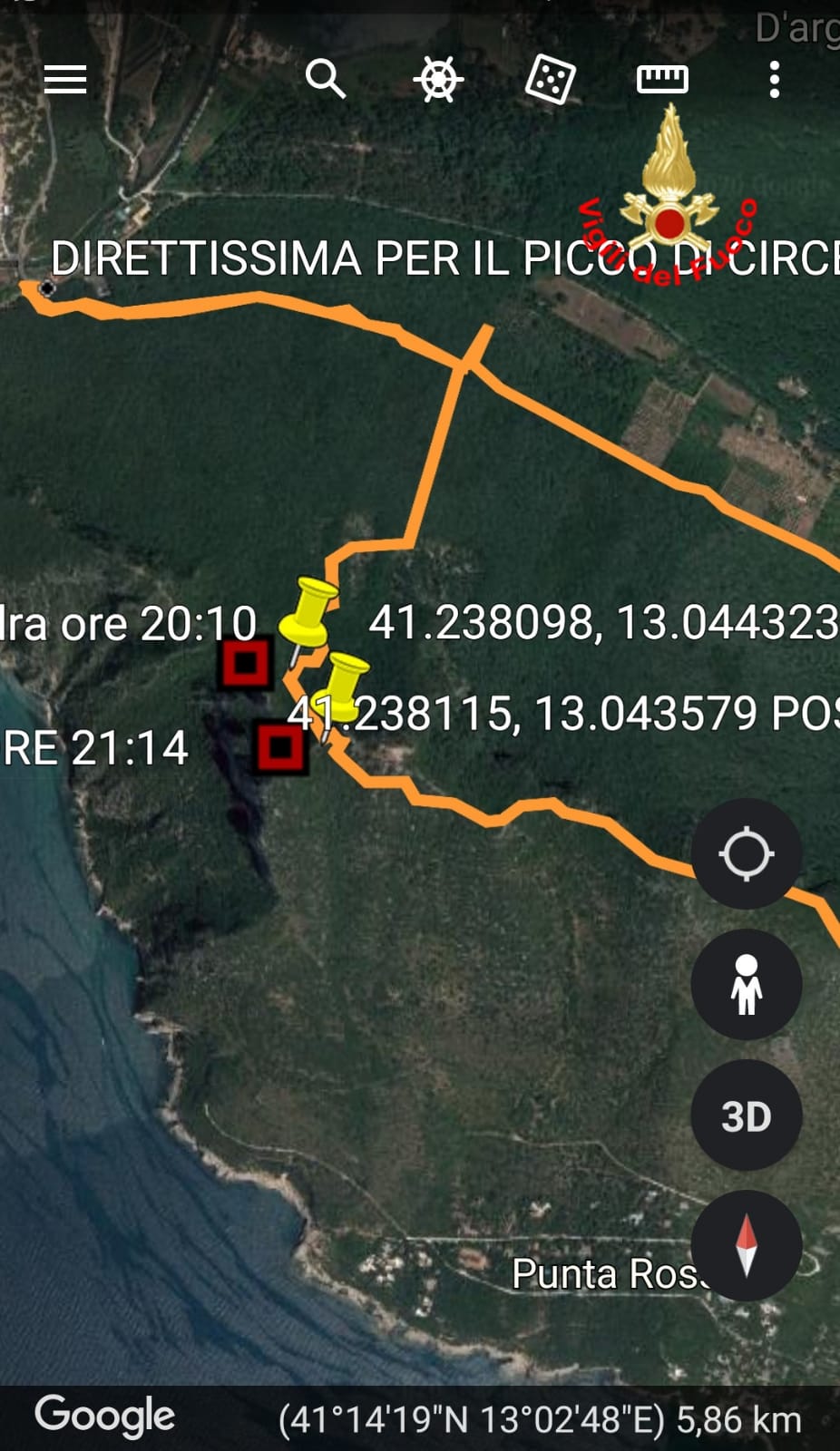 A quel punto il personale dei vigili del fuoco, insieme ai carabinieri forestali, iniziava a salire sul promontorio con il prezioso aiuto dei GPS in dotazione al personale specializzato TAS (Topografia Applicata al Soccorso).
