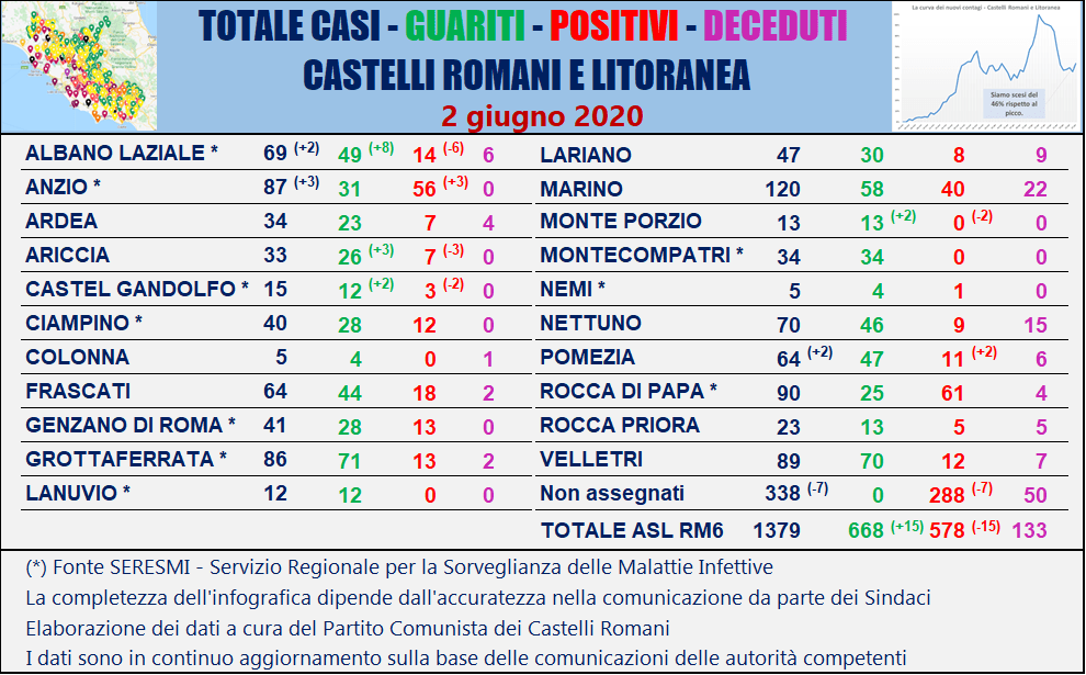 A causa di questo ritardo, per 10 comuni (Albano, Anzio, Castel Gandolfo, Ciampino, Genzano, Grottaferrata, Lanuvio, Montecompatri, Nemi, Rocca di Papa) il numero dei casi pubblicati dal SERESMI (il Servizio Regionale per la Sorveglianza delle Malattie Infettive) è superiore al numero di casi comunicati dai Sindaci.