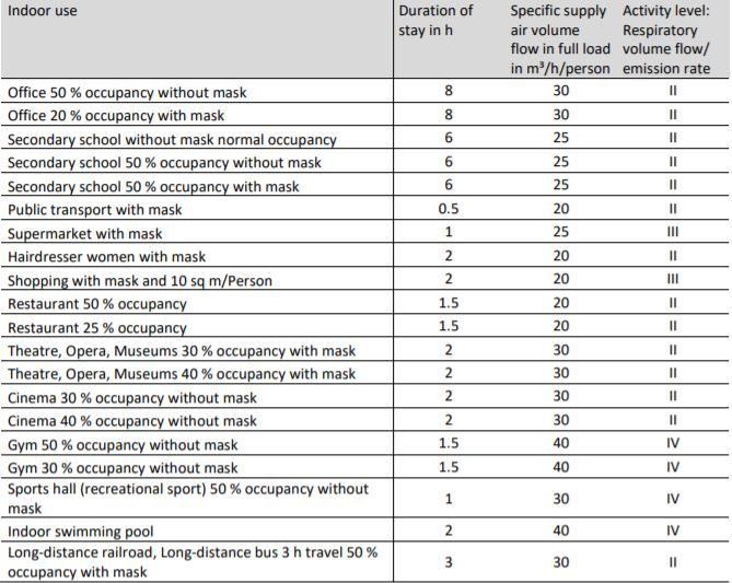 Di seguito sono riportate le tabelle che spiegano la classificazione dei luoghi maggiormente a rischio per tempo di permanenza, fornitura specifica volume d’aria flusso a pieno carico in m³/ h/ persona e livello di attività: Respiratorio portata volumetrica / tasso di emissione.