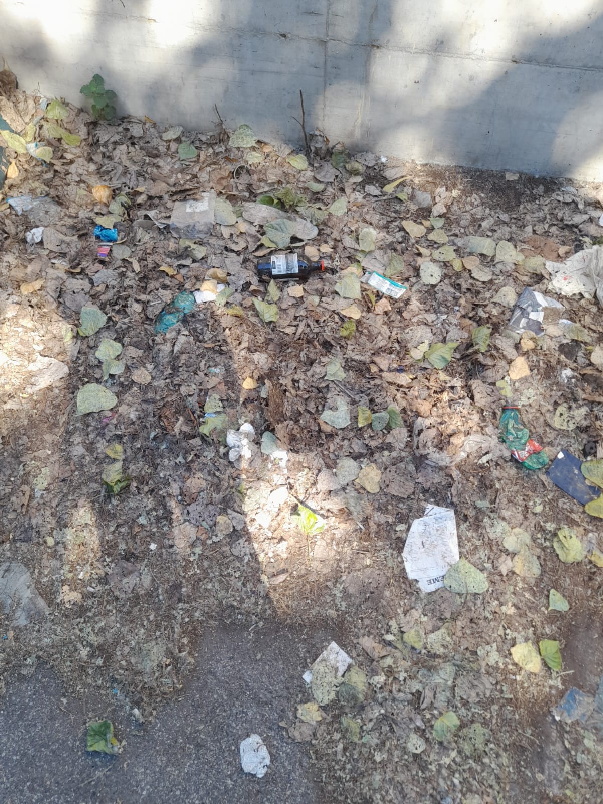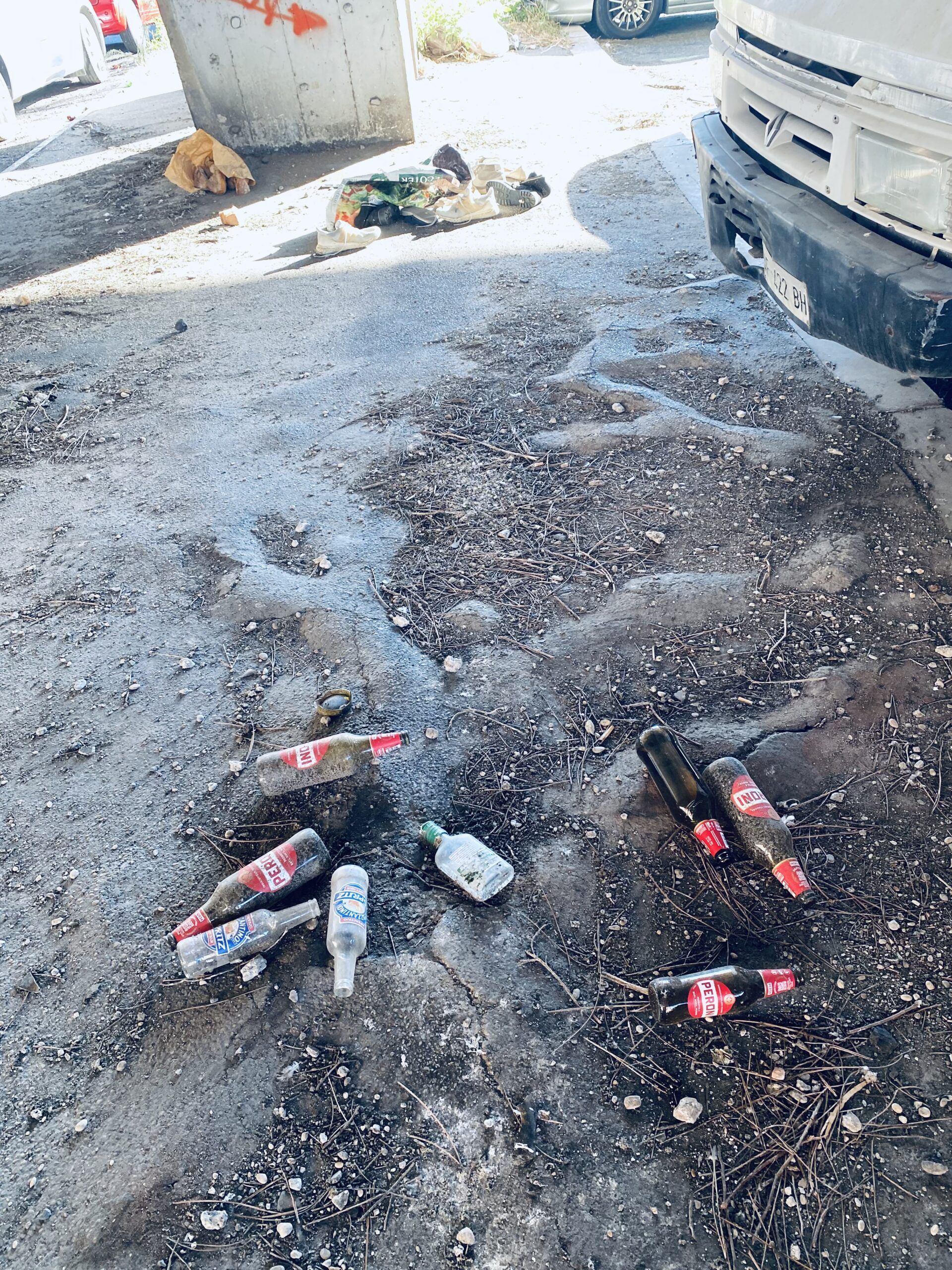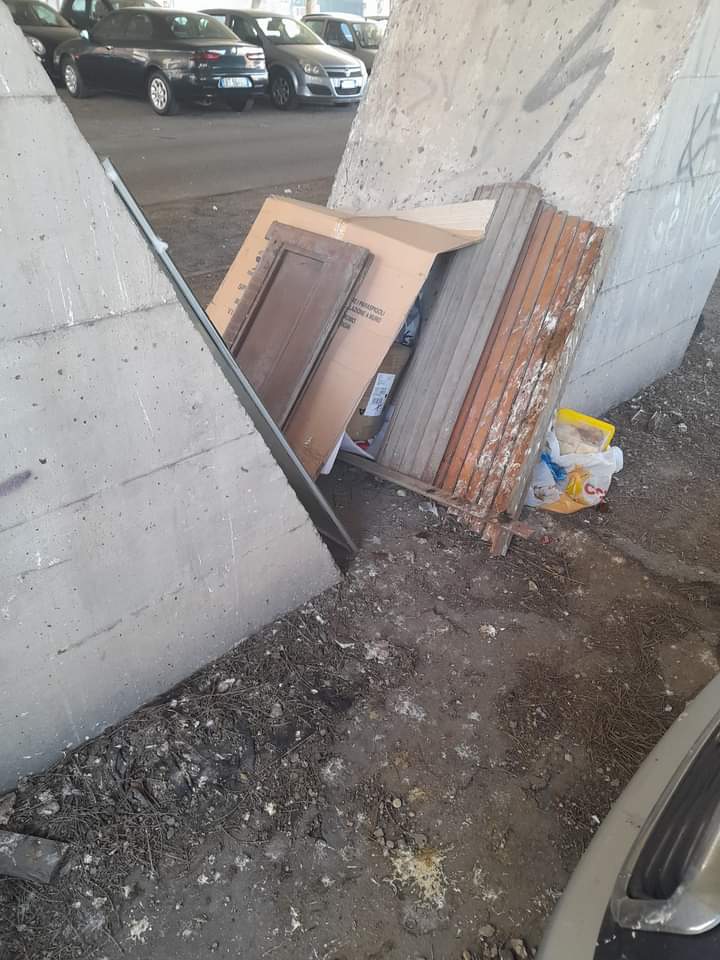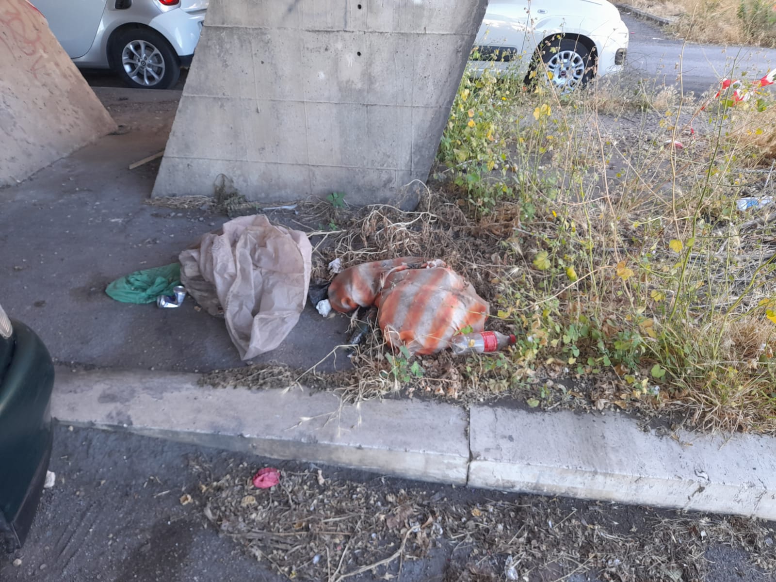 Accanto ai pilastri del cavalcavia sacchi di rifiuti, lasciati lì da chissà chi e mai raccolti. Le bottiglie si accumulano, alle birre si aggiunge qualche lattina di coca cola. Buste vuote gettate a terra si mischiano all’erba secca, schiacciate dalle ruote delle auto.