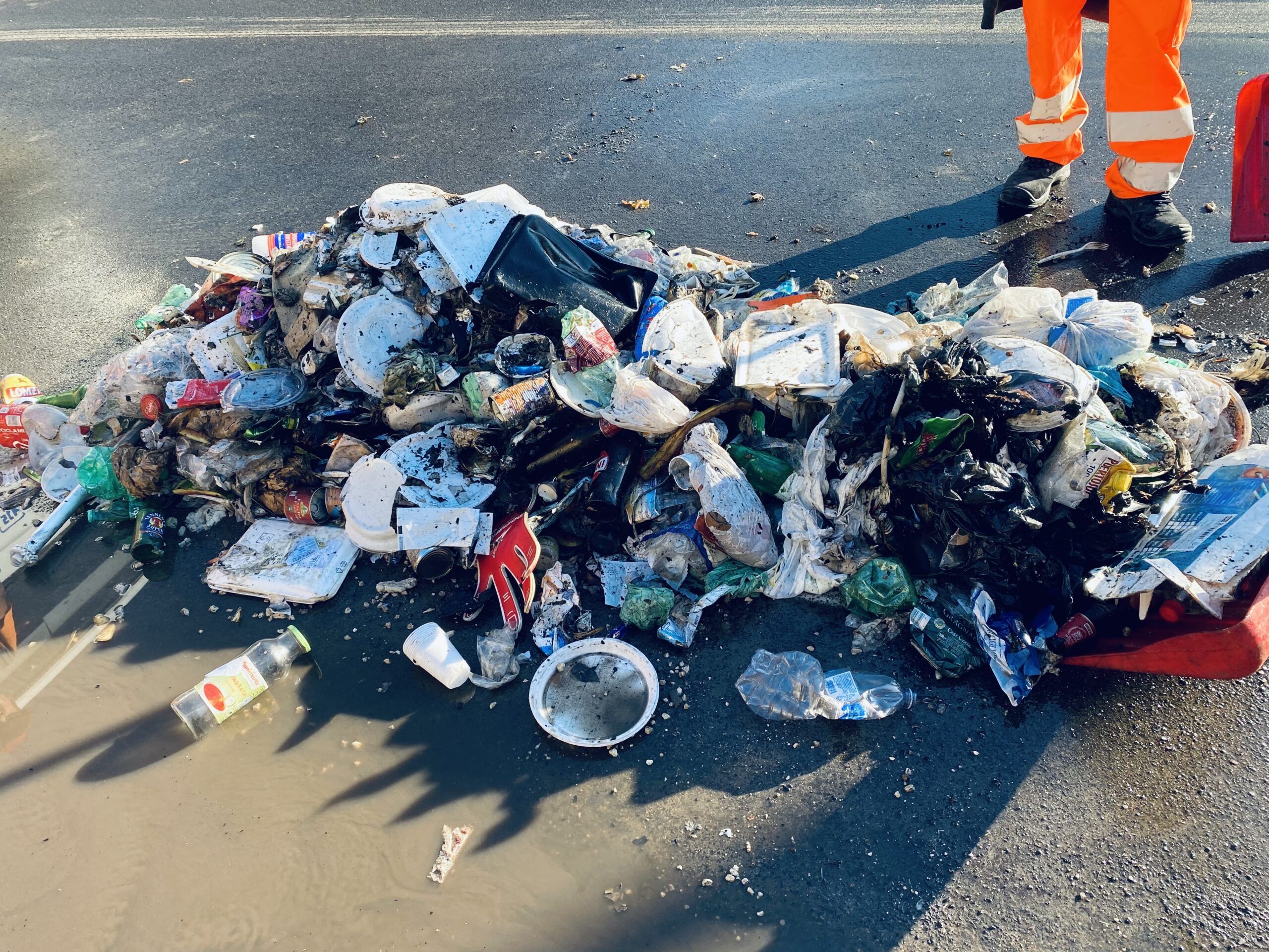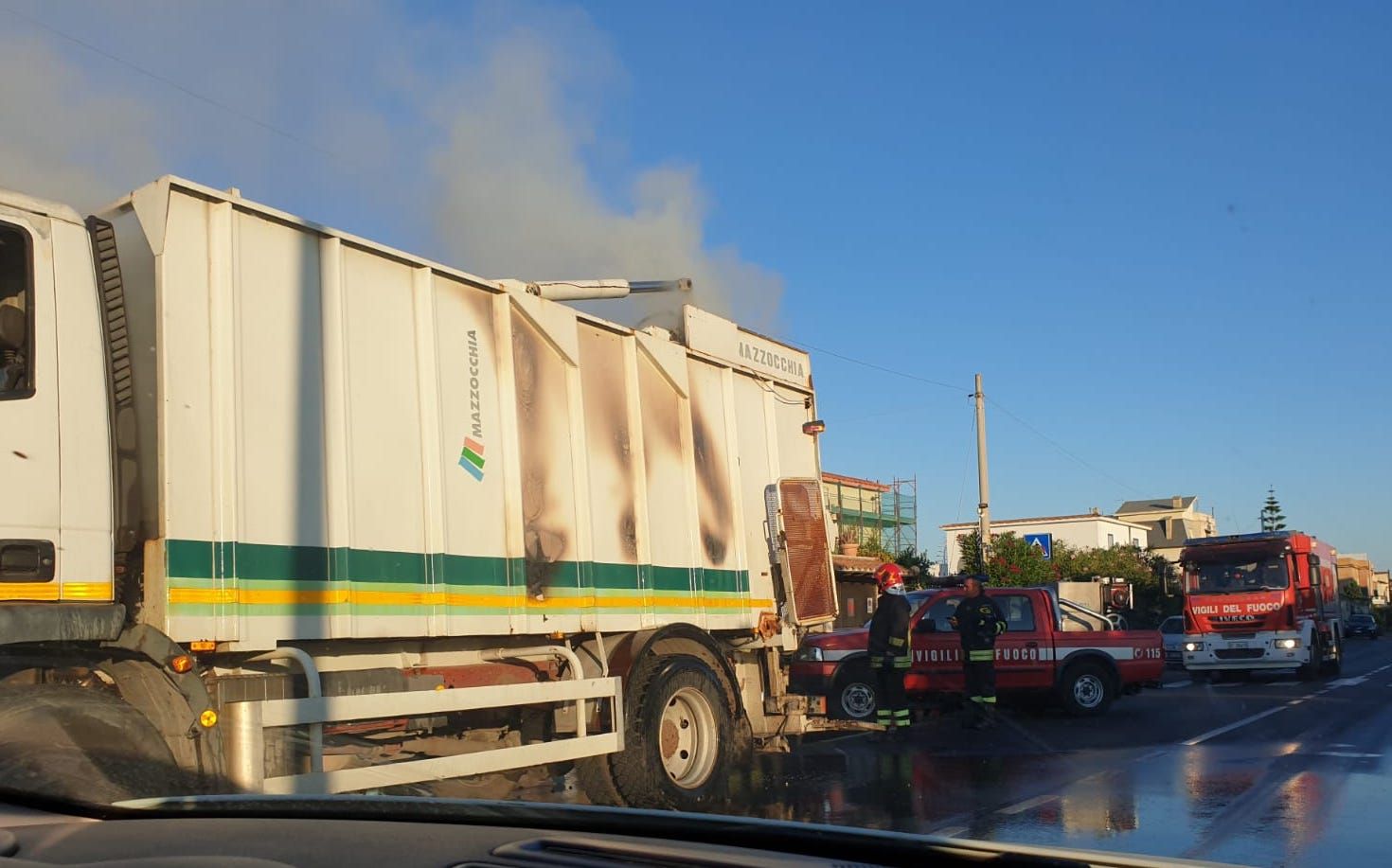 Nel contempo, i sacchi di rifiuti sono stati messi sulla strada per poterli spegnere e successivamente caricare su un altro mezzo.
