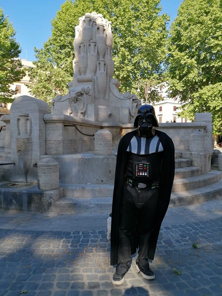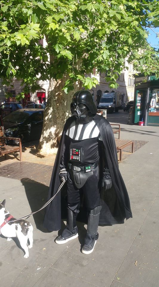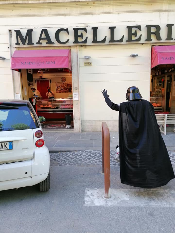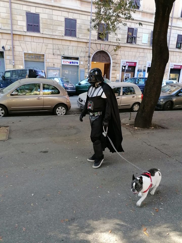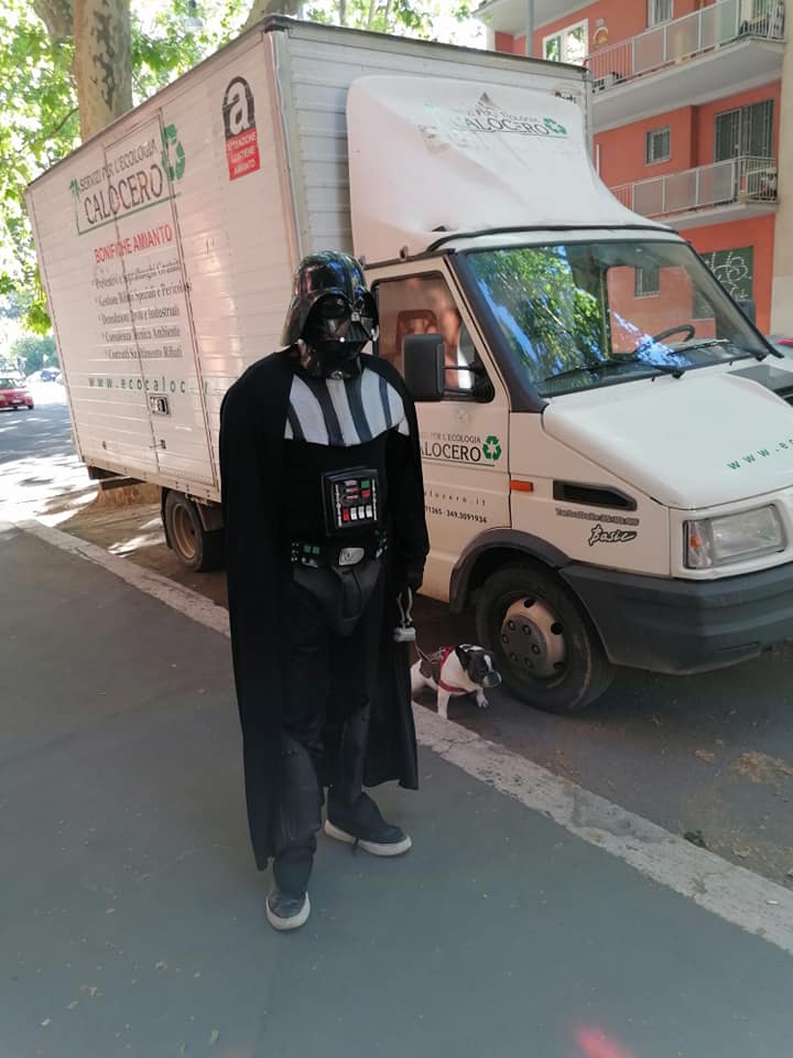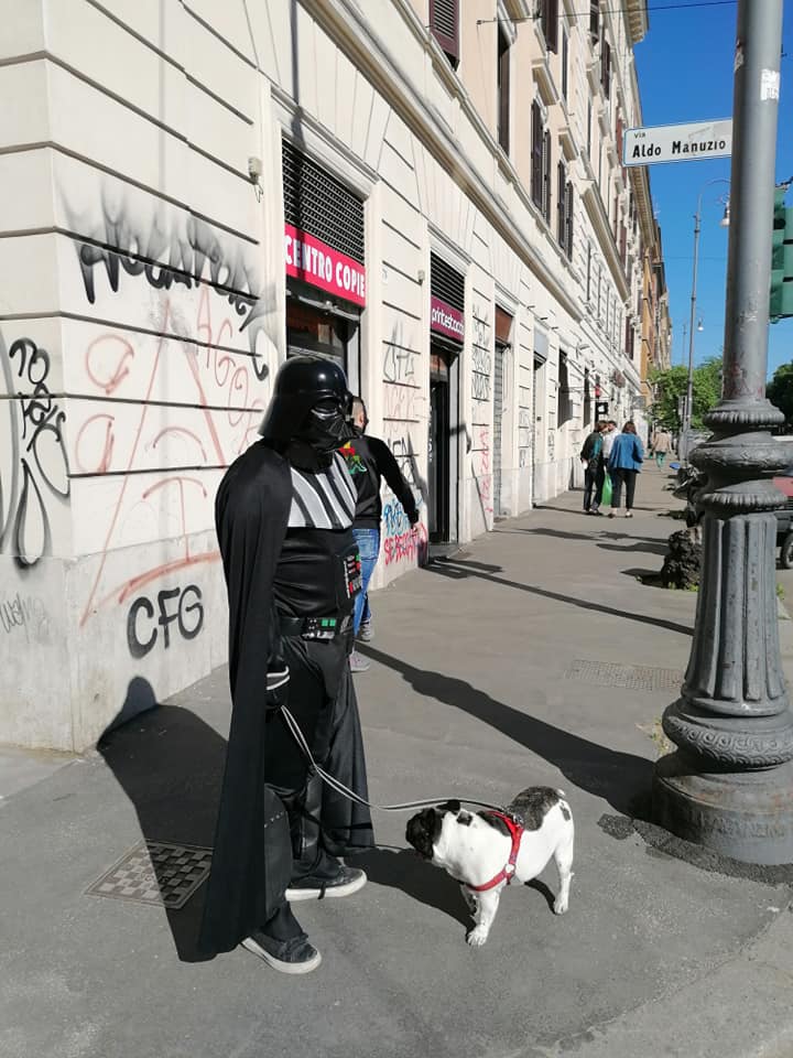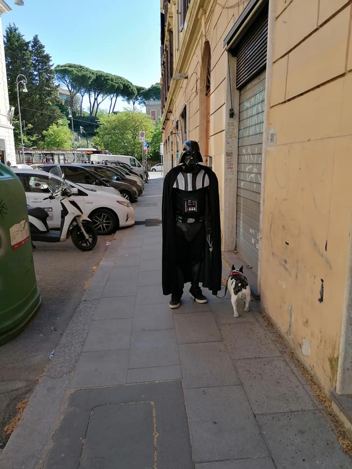 Fase 2, giorno 1. Viva l’ironia. Approfittando del fatto che proprio oggi si celebra lo Star Wars day, c’è chi ha deciso di fare la passeggiata con il cane non con la “mascherina d’ordinanza”, bensì con il costume di Darth Fener, uno dei protagonisti della saga di Guerre Stellari.