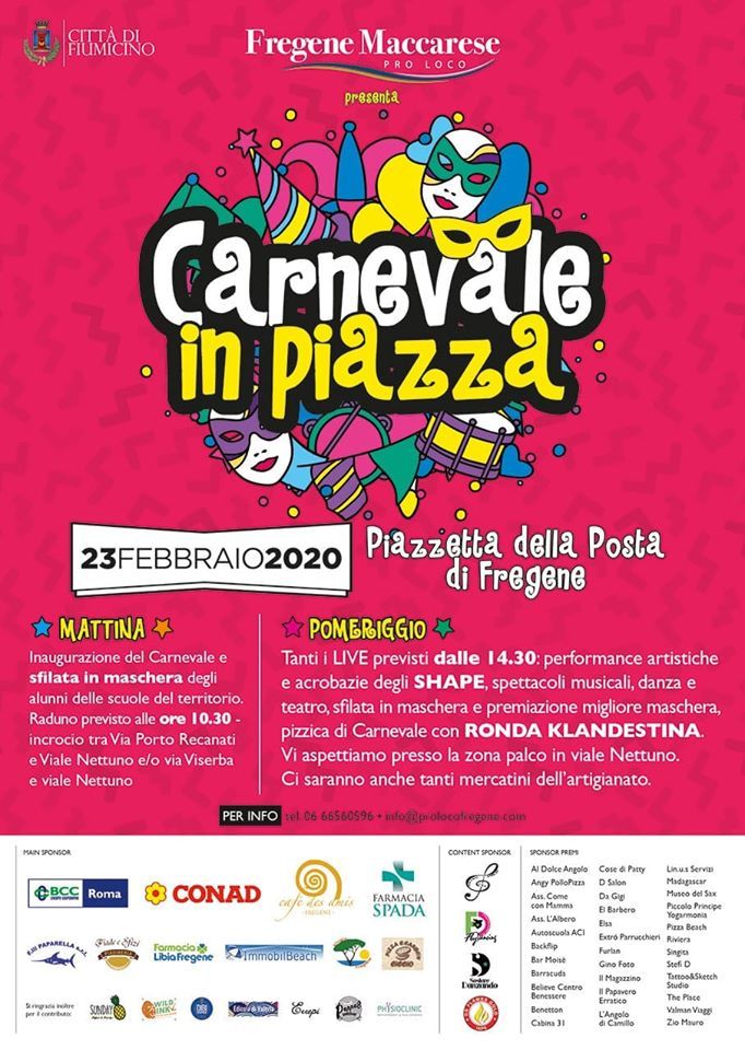 A Fregene nella piazzetta della posta la mattina di domenica alle 10.30 partirà la sfilata in maschera degli alunni delle scuole del territorio. Il pomeriggio, dalle 14.30, sarà dedicato al puro intrattenimento: sul palco si alterneranno diversi artisti e le loro esibizioni saranno intervallate dal Concorso per la migliore maschera. Ci sarà anche un mercatino artigianale.