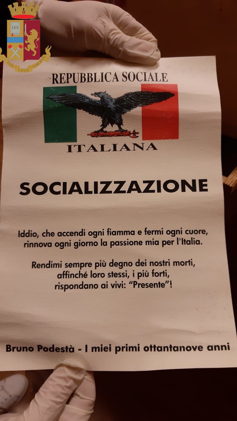Sono stati sgomberati questa mattina dalla Polizia due locali: uno a Maccarese e l’altro in zona Primavalle. E’ stato sequestrato molto materiale riconducibile al periodo e alla propaganda del fascismo e del nazismo.