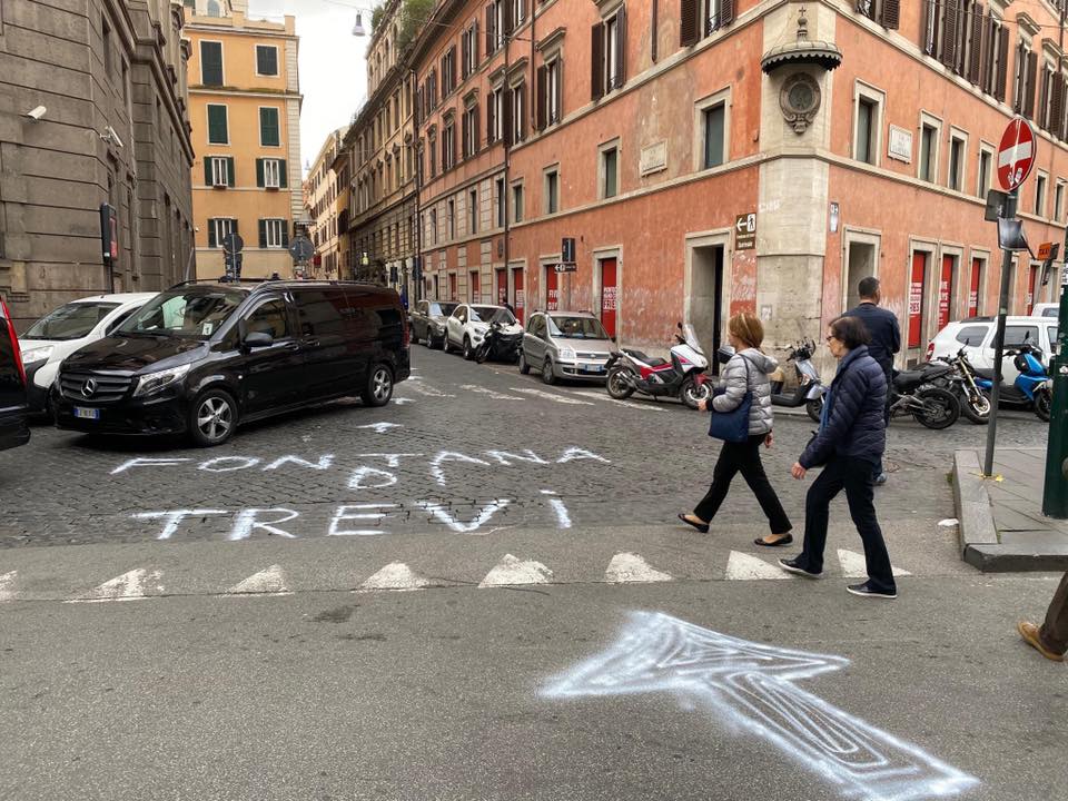 Il Comune sgombra l’area limitrofa alla fontana di Trevi dalle bancarelle? E allora cosa si fa per far sì che i turisti ci passino comunque davanti? Niente di più facile: si cancella la segnaletica messa dall’amministrazione e se ne crea una “farlocca”, molto artigianale, per “costringere” chi non è del posto a fare un giro più lungo che comprenda il tour delle cianfrusaglie.