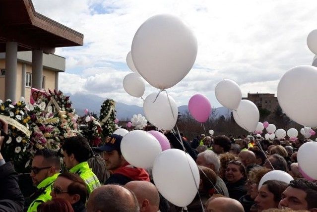 Sulle bare delle due bimbe sono stati adagiati cuscini di fiori bianchi, mentre all’esterno sono pronti centinaia di palloncini rosa e bianchi che a breve, all’uscita dalla chiesa delle due salme, saranno liberati in aria.