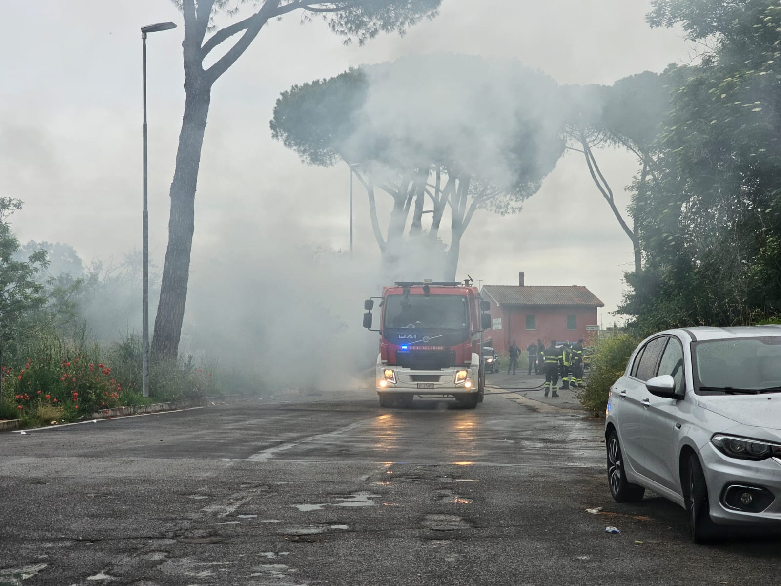 Un incendio nelle prime ore di oggi pomeriggio, sabato 13 maggio, ha fatto accorrere in via dell’Albuccione, all’incrocio con via Tiburtina Valeria, i Vigili del fuoco, gli uomini della Guardia di Finanza e gli agenti della Polizia locale di Roma Capitale, L’allarme è stato dato, probabilmente, da automobilisti che nell’attraversare il tratto di strada si sono trovati di fronte al rogo e a una densa nuvola di fumo.