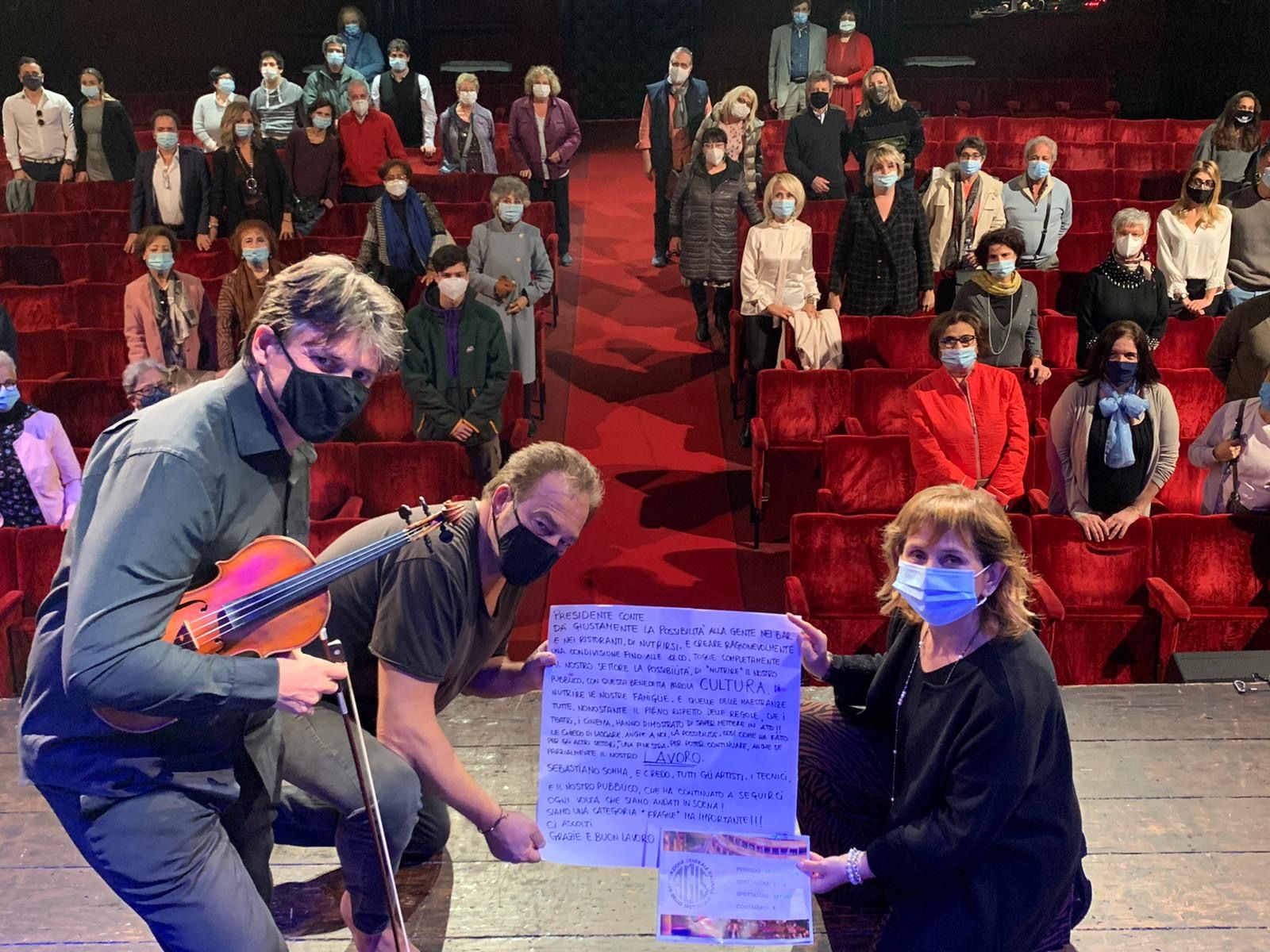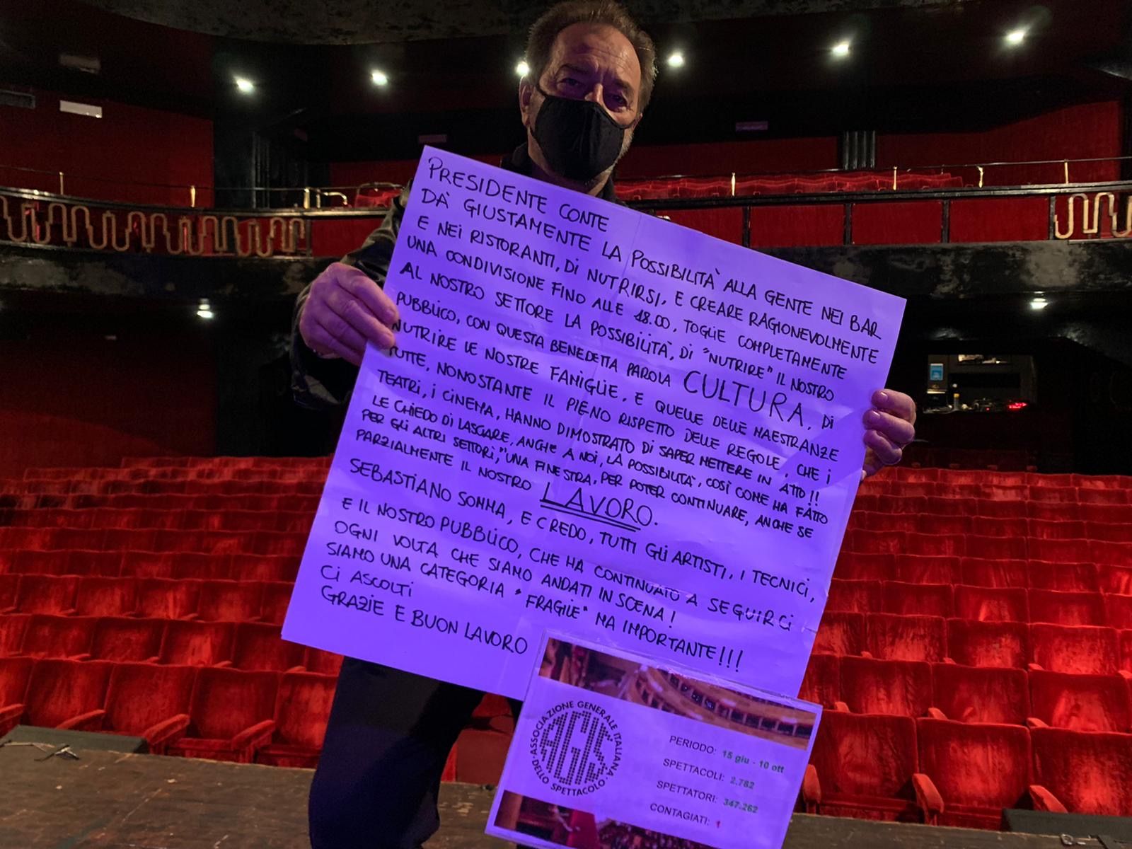 lei da’ giustamente la possibilità alla gente nei bar e ristoranti di nutrirsi e creare ragionevolmente una condivisione fino alle 18, ma toglie completamente la possibilità di “nutrire” il nostro pubblico con questa benedetta parola: CULTURA, e di nutrire le nostre famiglie, quelle delle maestranze tutte, nonostante il pieno rispetto delle regole che i teatri e i cinema, hanno dimostrato di saper mettere in atto! Le chiedo di lasciare anche a noi una possibilità, così come ha fatto per altri settori, di lasciare una finestra, per poter continuare, anche se parzialmente, il nostro LAVORO“.