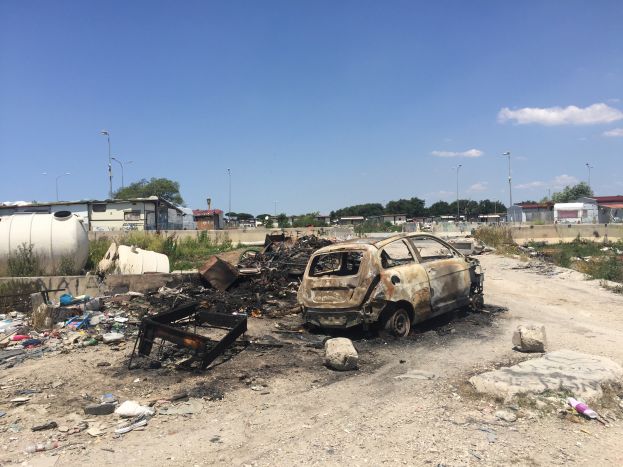 Un anno e mezzo dopo il nostro servizio sul cimitero delle auto rubate, siamo tornati al campo rom di via Pontina, a Castel Romano, dove le da due giorni consecutivi i vigili del fuoco sono impegnati a spegnere incendi di rifiuti di varia natura. Questa volta – memori di quanto accaduto in passato, ovvero dell’aggressione subita per evitare che fossero effettuate le riprese – siamo entrati scortati da polizia e vigili del fuoco. Dentro l’aria è acre, il fumo viene spinto dal leggero vento che continua ad alimentare le fiamme sotto quelli che sembravano focolai già spenti. La “vallata dell’inferno”, rispetto a 19 mesi fa, ha assunto un colore diverso: è molto meno verde. Tanta vegetazione – ricordiamo che questa è una riserva naturale protetta – in questo lasso di tempo è andata distrutta e insieme ad essa carcasse di auto, frigoriferi, pneumatici, mobili vecchi, materassi, reti in metallo, divani, poltrone. E scarti di tutti i tipi.