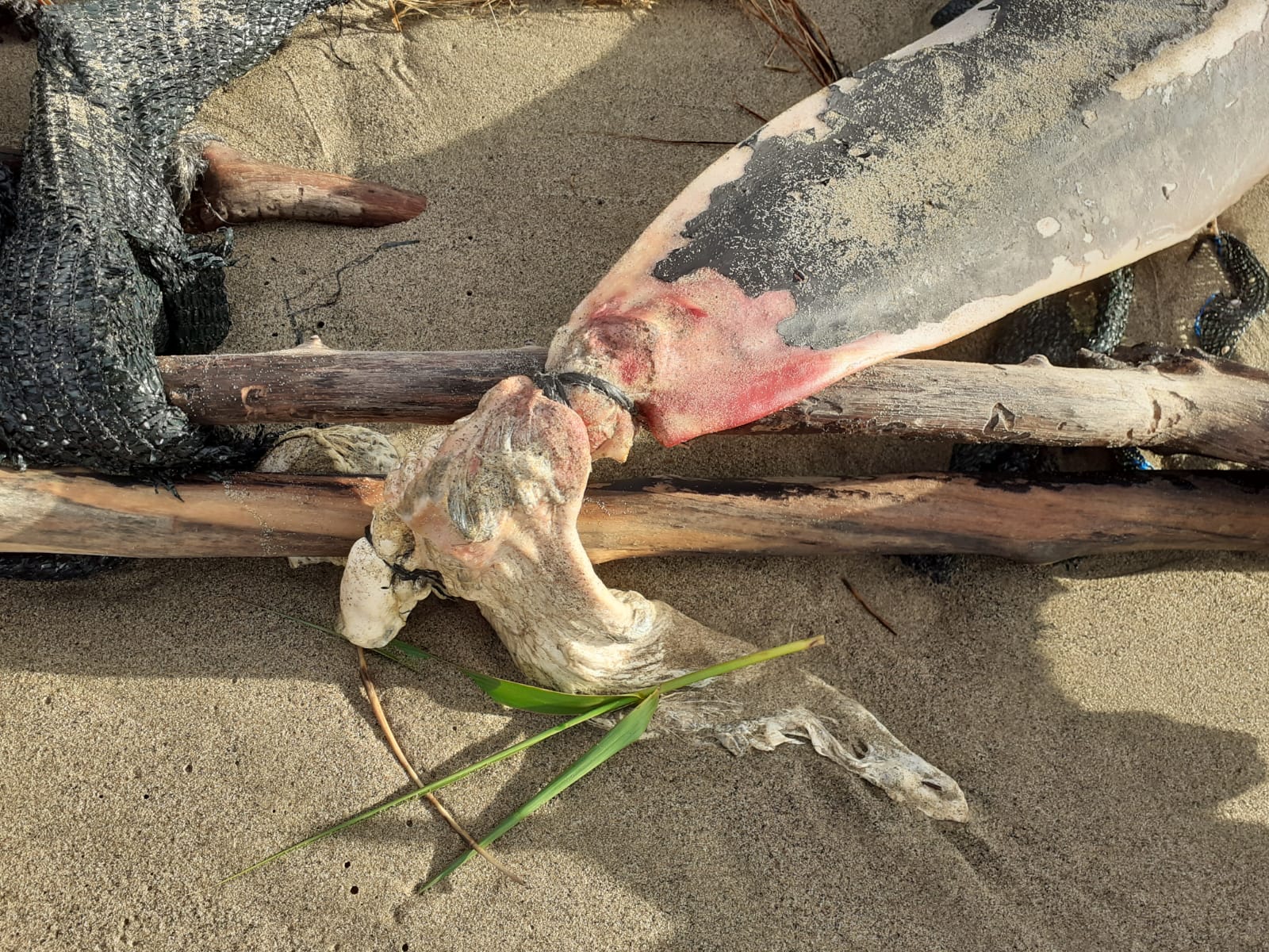 “Si tratta di un esemplare femmina di stenella striata della lunghezza totale di 178 cm – ha dichiarato Valerio Manfrini, biologo del Centro Studi Cetacei – Era legata, all’altezza della coda, tramite una fune di nylon a un ammasso informe di legni, ombreggiante, rifiuti vari e barili di plastica come quelli usati per le reti da posta. Lo strozzamento a ridosso della coda è avvenuto quando l’animale era ancora in vita, testimonato dalla necrosi della coda stessa. È probabile che lo strozzamento della fune sia stato causato dai tentativi del delfino di liberarsi”.
