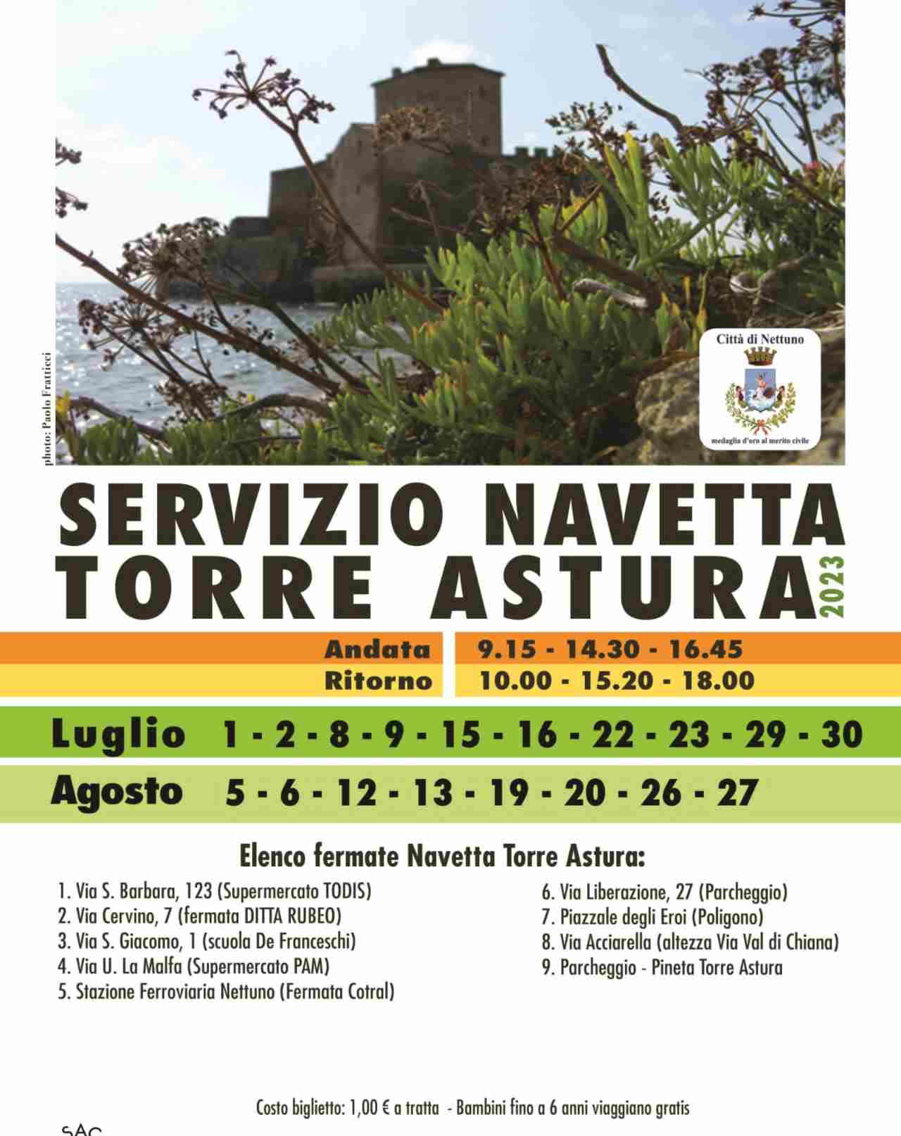 Come detto in apertura il Comune di Nettuno, in collaborazione con Sac Mobilità, metterà a disposizione nei giorni da sabato e domenica una navetta al costo di 1 euro a tratta che collegherà il centro Nettuno con l’ingresso della spiaggia di Torre Astura. Di seguito gli orari e le fermate del bus navetta.