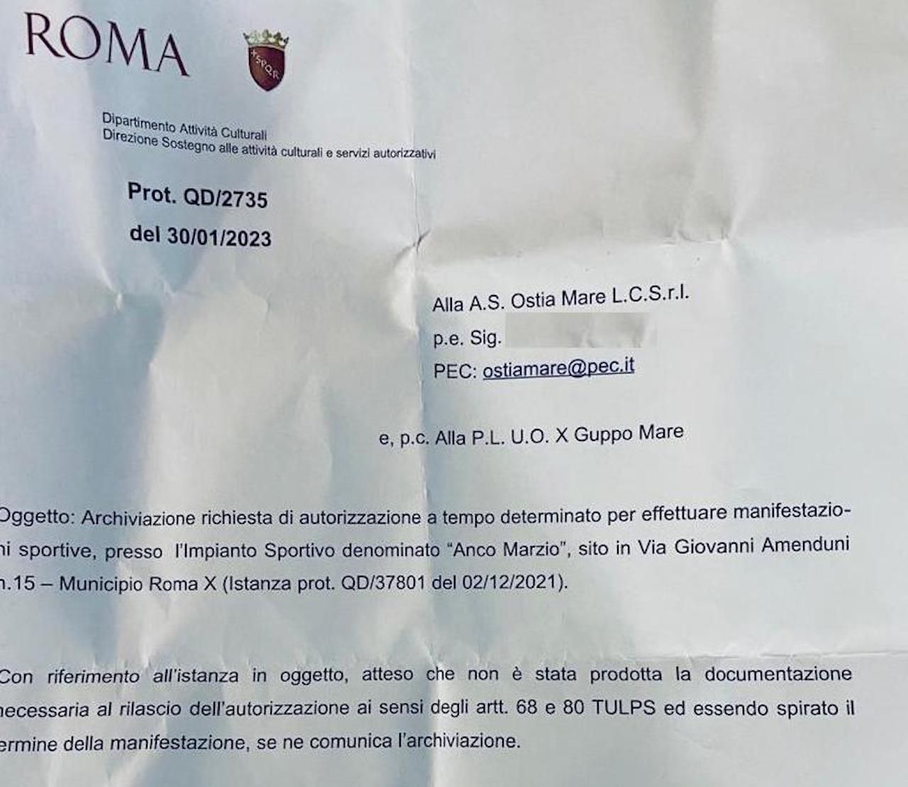 Ma, nonostante la domanda, non viene prodotta la documentazione necessaria per ottenere il permesso, come dimostra il diniego arrivato – chissà perché – con ben 14 mesi di ritardo. “Con riferimento all’istanza in oggetto – si legge nella lettera arrivata all’Ostiamare, oltre che alla polizia locale di Ostia, nei giorni scorsi – atteso che non è stata prodotta la documentazione necessaria al rilascio dell’autorizzazione ai sensi degli articoli 68 e 80 del TULPS ed essendo spirato il termine della manifestazione, se ne comunica l’archiviazione“. Ma se mancava la documentazione, perché non dirlo subito? Perché non mandare in tempi stretti una pec, come fatto adesso?