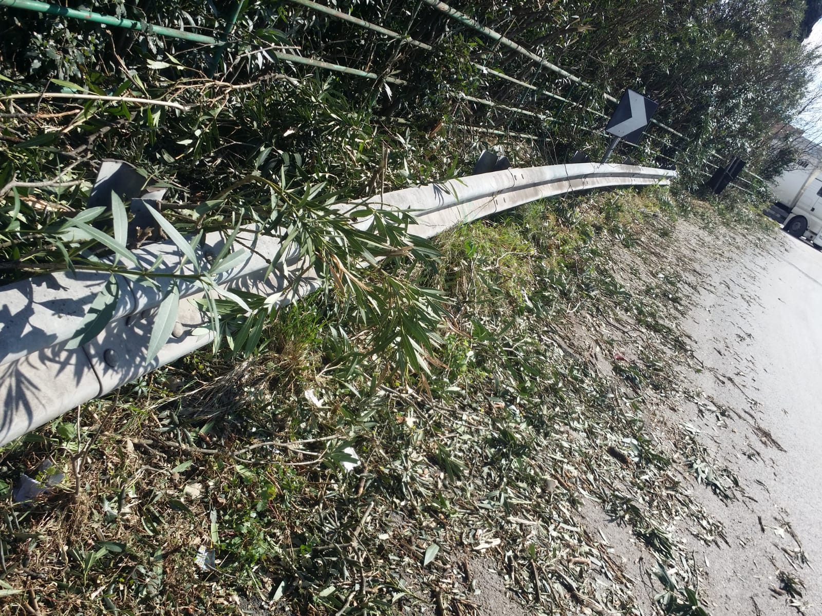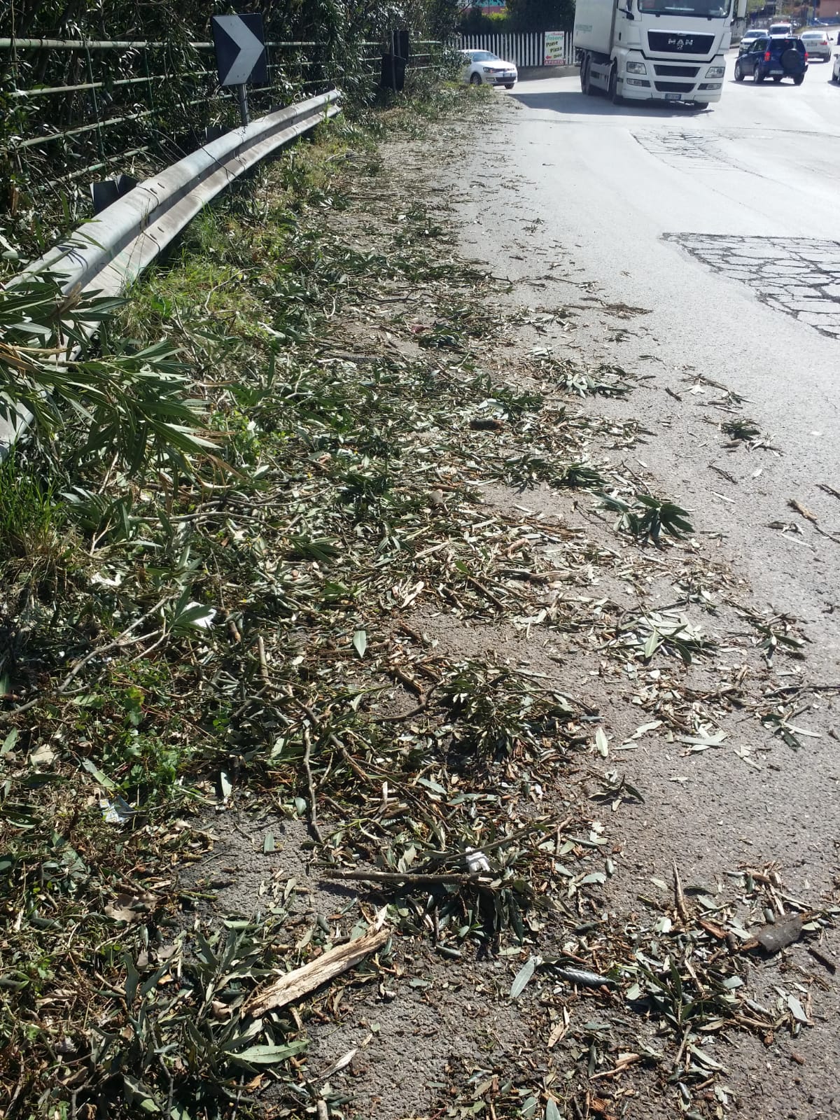 Alcuni operai hanno tagliato le siepi che costeggiano la strada ma hanno “dimenticato” di raccogliere il verde, lasciando sull’asfalto fogliame e rami, rendendo così pericoloso il tratto di strada per le auto in transito.
