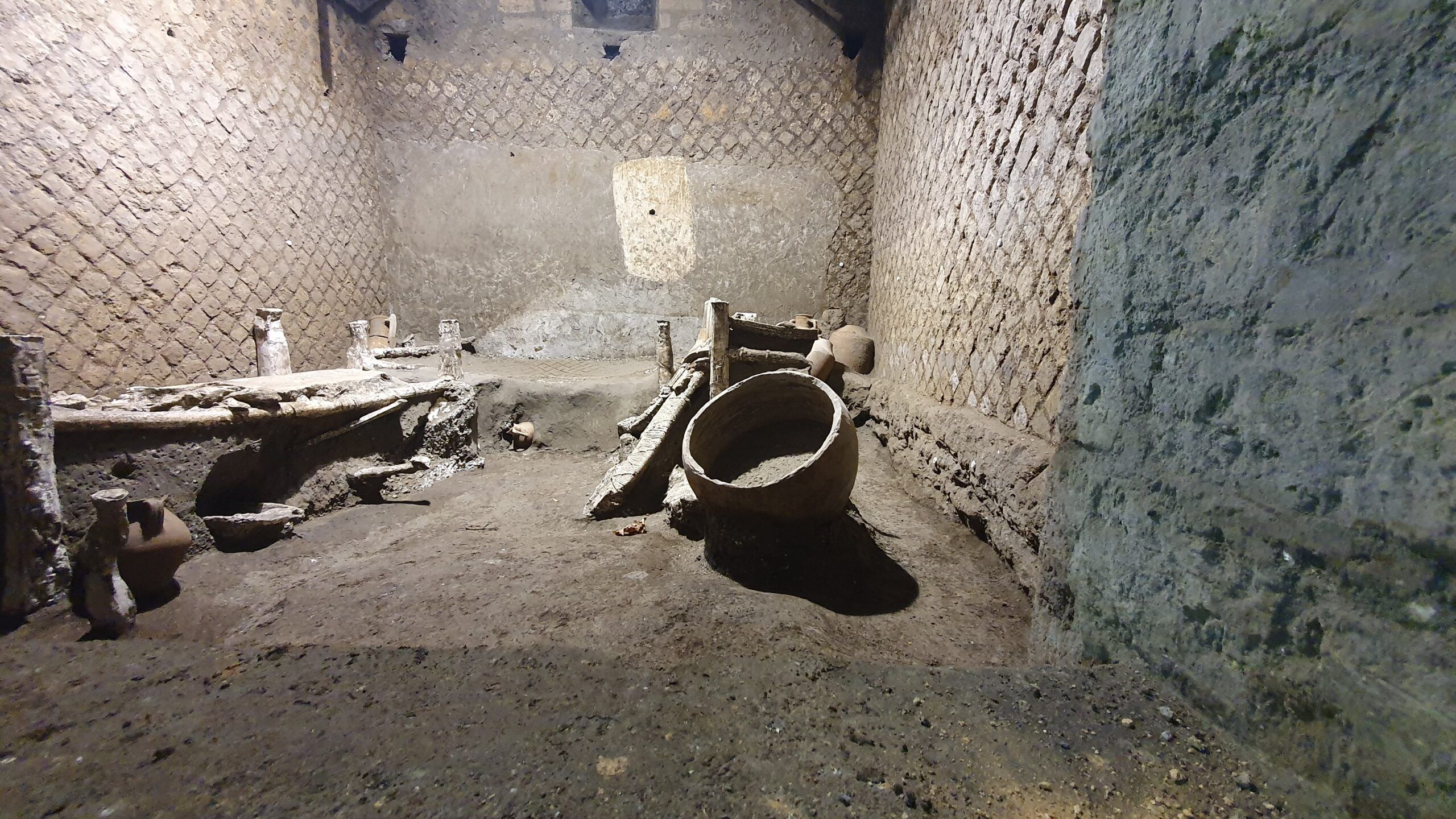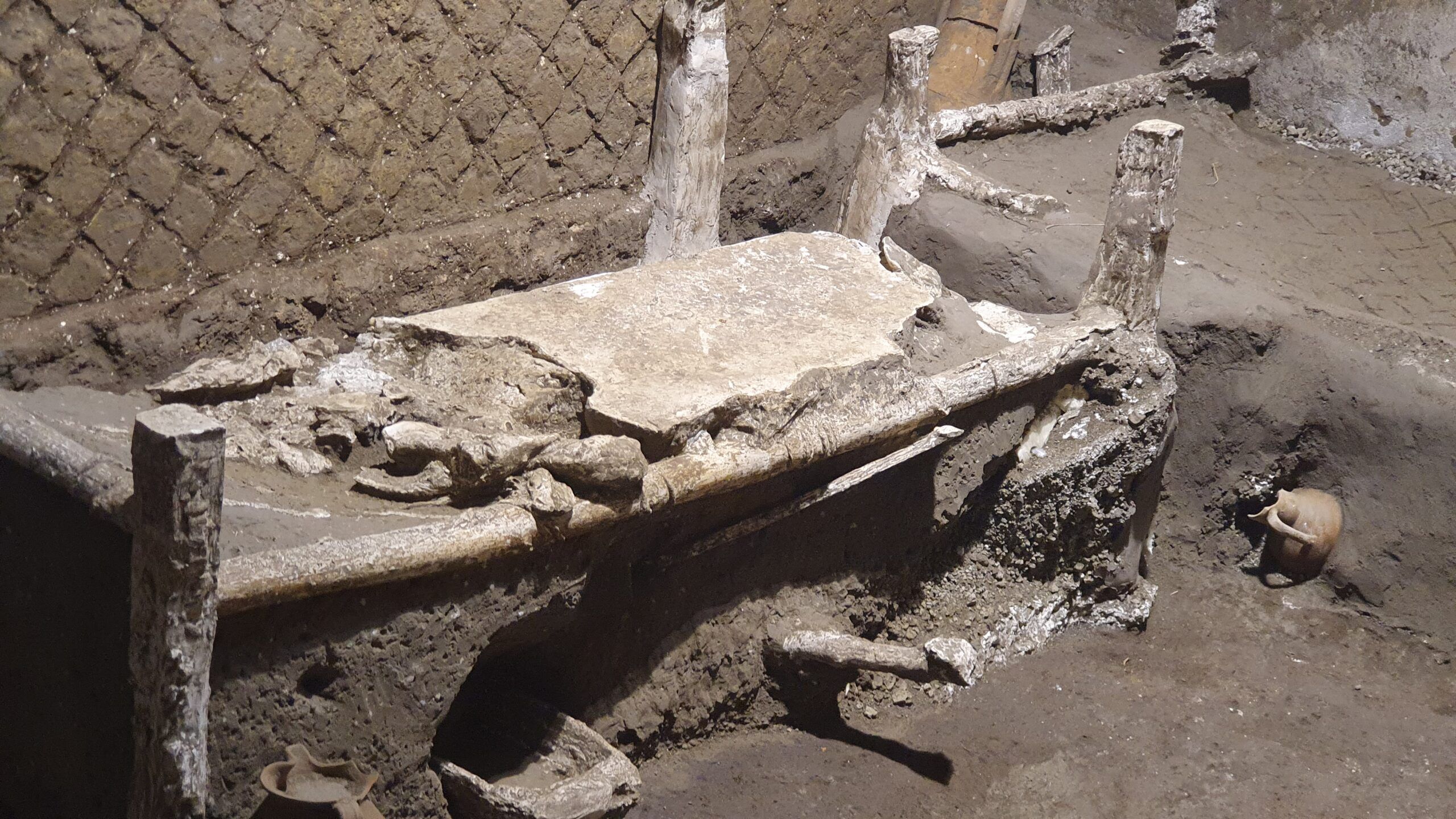 Il rinvenimento è avvenuto non lontano dal portico della villa dove, nel gennaio 2021, fu scoperto un carro cerimoniale attualmente in restauro. A pochi passi da lì emerge ora uno dei modesti alloggi degli addetti che si occupavano del lavoro quotidiano in una villa romana, inclusa la manutenzione e la preparazione del carro. Nell’ambiente, dove sono state trovate tre brandine in legno, infatti, è stata rinvenuta una cassa lignea con oggetti in metallo e in tessuto che sembrano far parte dei finimenti dei cavalli. Inoltre, appoggiato su uno dei letti, è stato trovato un timone di un carro, di cui è stato effettuato un calco. I letti sono composti da poche assi lignee sommariamente lavorate che potevano essere assemblate a seconda dell’altezza di chi li usava. Mentre due hanno una lunghezza pari a 1,70 m circa, un letto misura appena 1,40 m per cui potrebbe essere di un ragazzo o di un bambino. La rete dei letti è formata da corde, le cui impronte sono parzialmente leggibili nella cinerite, e al di sopra delle quali furono messe coperte in tessuto, anch’esse conservate come cavità nel terreno e restituite attraverso il metodo dei calchi. Al di sotto delle brandine si trovavano pochi oggetti personali, tra cui anfore poggiate per conservare oggetti, brocche in ceramica e il “vaso da notte”. L’ambiente era illuminato da una piccola finestra in alto e non presentava decorazioni parietali. Oltre a fungere da dormitorio per un gruppo di schiavi, forse una piccola famiglia come lascerebbe intuire la brandina a misura di bambino, l’ambiente serviva come ripostiglio, come dimostrano otto anfore stipate negli angoli lascati appositamente liberi per tal scopo.