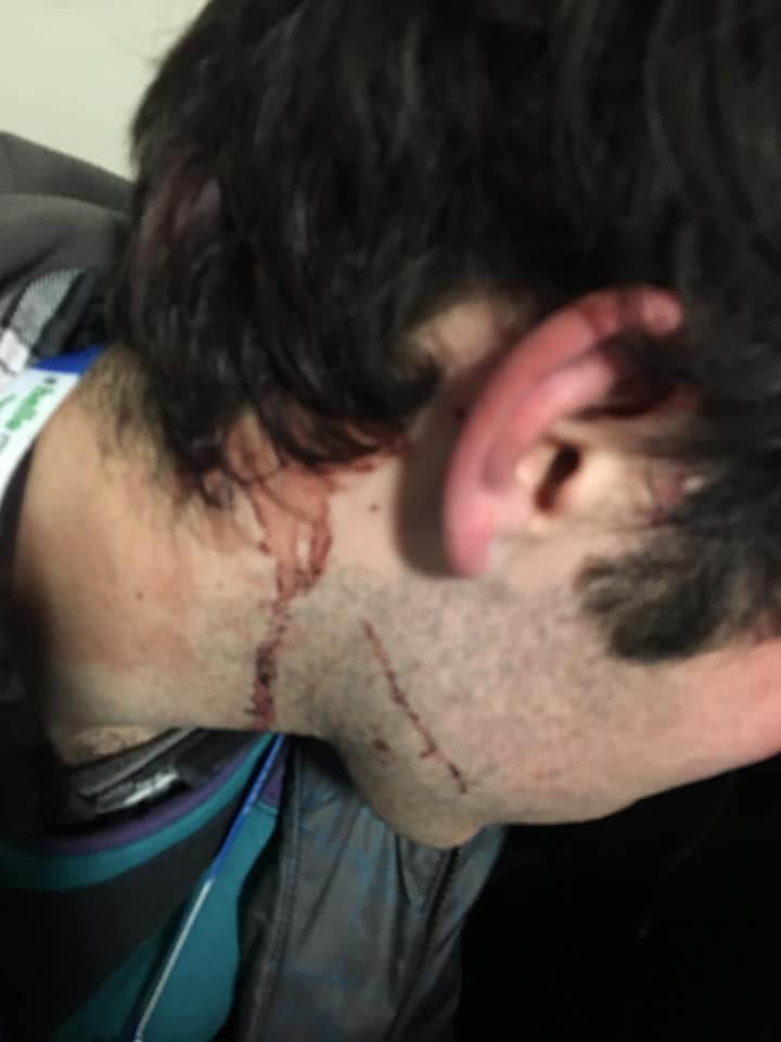 Le parole di Marzio sono pacate, mentre mostra lividi, contusioni e ferite in faccia e sul collo.