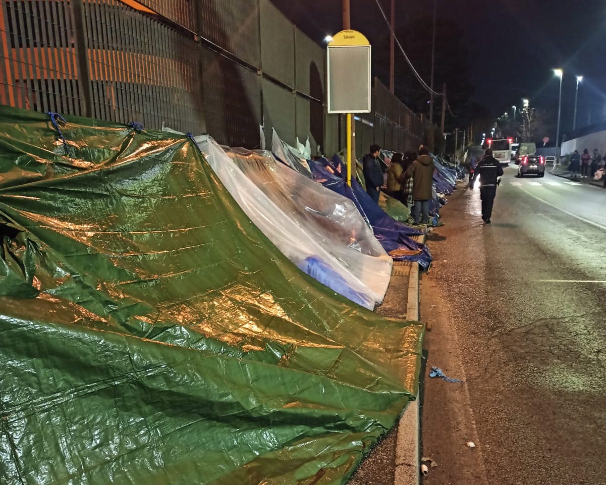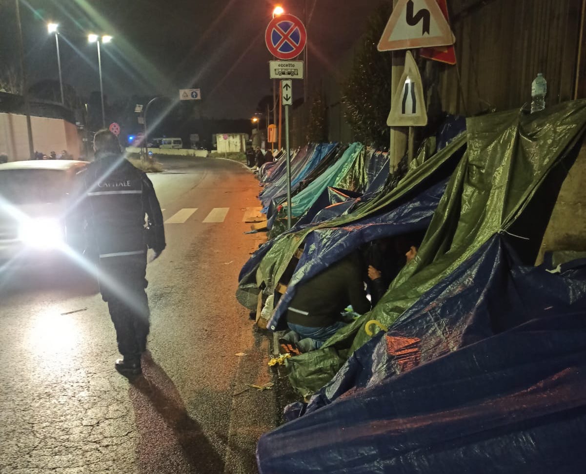“Da circa una settimana un vero e proprio accampamento spontaneo è sorto su Via Salviati, proprio a ridosso del muro di recinzione dell’ufficio immigrazione e dell’ufficio stranieri della Questura di Roma. Dapprima pochi giacigli, di chi probabilmente intendeva assicurarsi un posto tra i primi della fila al momento dell’apertura degli uffici. Ma con il passare dei giorni sono comparse e aumentate le tende. Un insediamento spontaneo, che ha inglobato marciapiede, fermata del bus e pensiline, riducendo visibilità e sicurezza per chi si trovi a transitare su una strada dove le macchine transitano anche abbastanza veloci. Il paradosso è che a pochi metri si trovino a stazionare autopattuglie della Polizia Locale di Roma Capitale, ormai da anni impegnate a piantonare l’ingresso del limitrofo campo nomadi mai autorizzato ma “tollerato” di Via Salviati e spesso proprio personale di quel gruppo speciale (Sicurezza Pubblica Emergenziale), che si dovrebbe occupare proprio di controllo e sgombero degli insediamenti abusivi, stando all’organigramma del Corpo”.