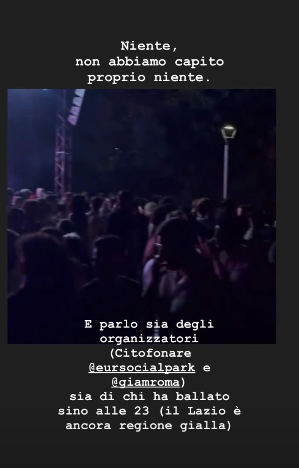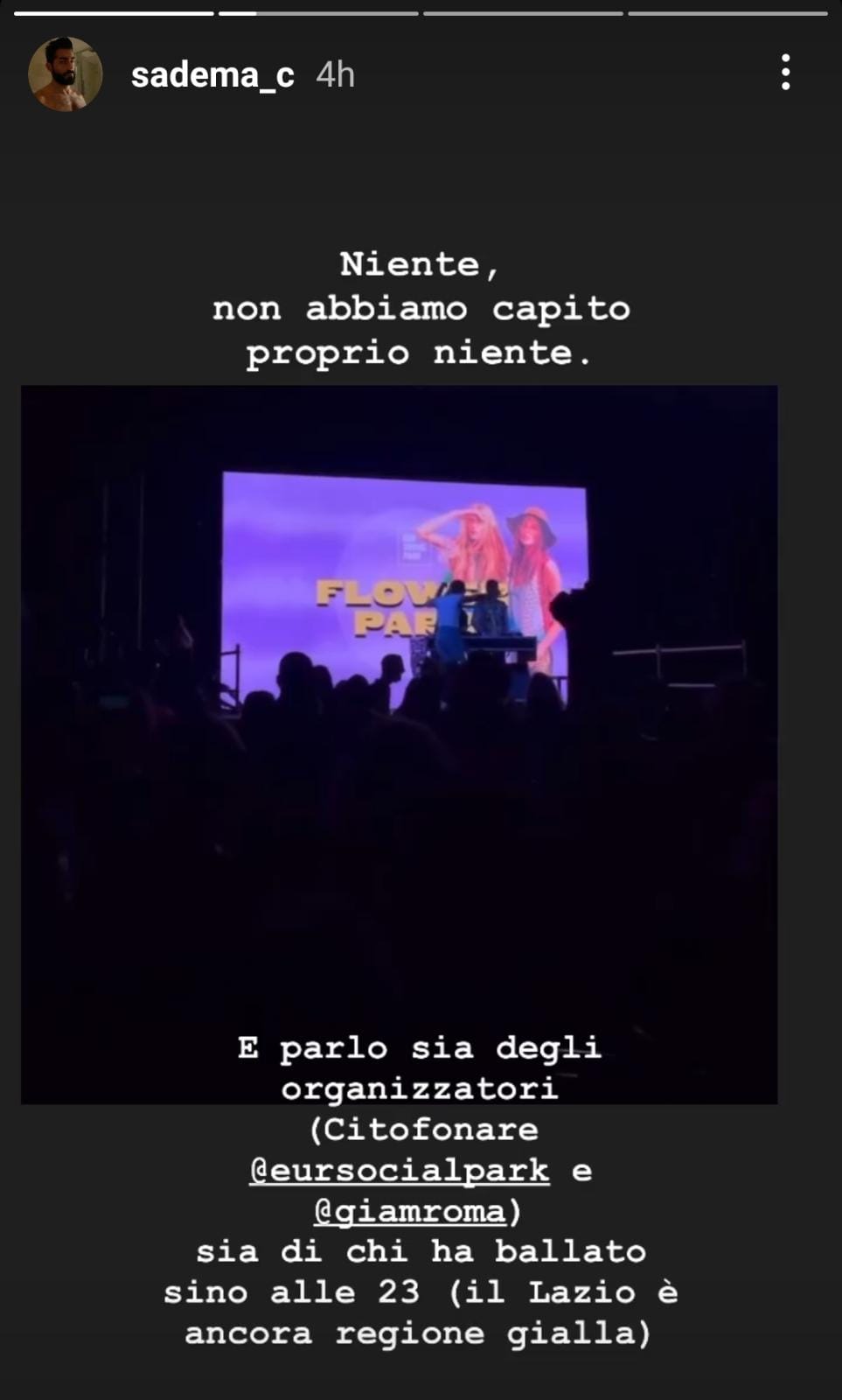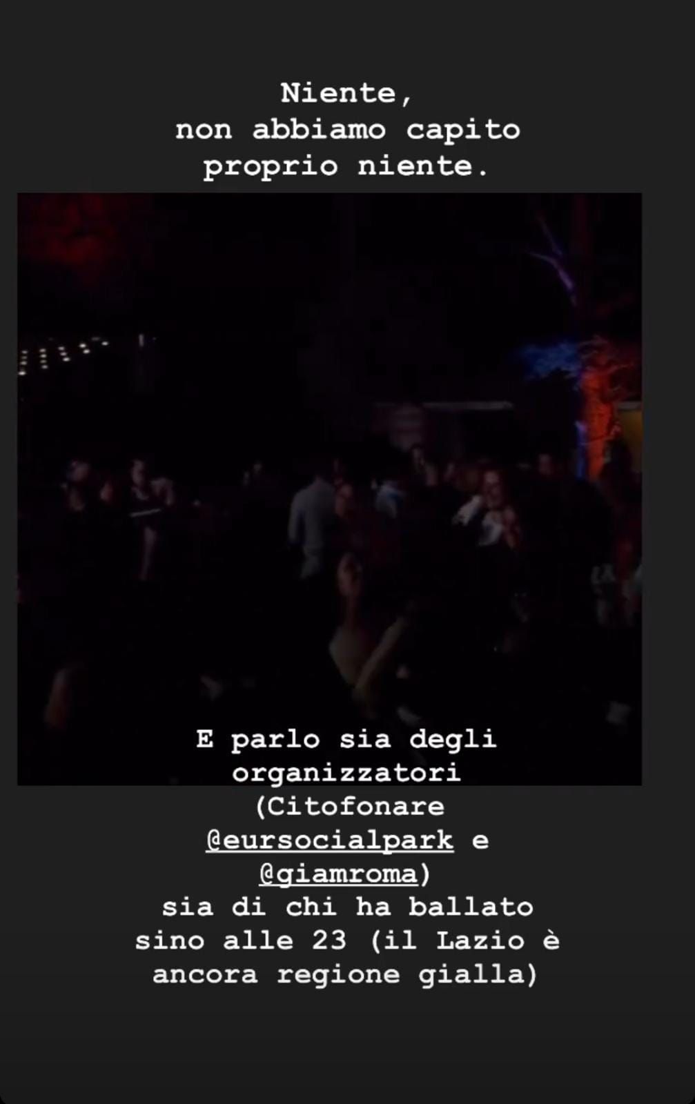 Ieri sera, al centro del quartiere Eur, in uno spazio aperto, era stato indetto l’evento Flower Park. Questo sarebbe durato dalle 17:00 del pomeriggio fino alle 23:00. I ragazzi, vestiti a tema, non si sono fatti fuggire l’occasione e, presi dalla foga del momento, hanno ballato ammassati senza mascherina e senza distanziamento sulle note del dj incaricato della serata. A parlare di ciò che è successo, è stato Salvo, giornalista freelance: “Niente non abbiamo capito proprio niente e parlo sia degli organizzatori e sia di chi ha ballato sino alle 23 (il Lazio è ancora in zona gialla). Comunque no, io non c’ero, il video non è mio. Comunque sì, anche io avrei voglia di ballare e fare quello che mi pare e piace (è proprio per questo che faccio quello che si può). Comunque non so, concetti come rispetto, professionalità e intelligenza sono diventati troppo demodè”