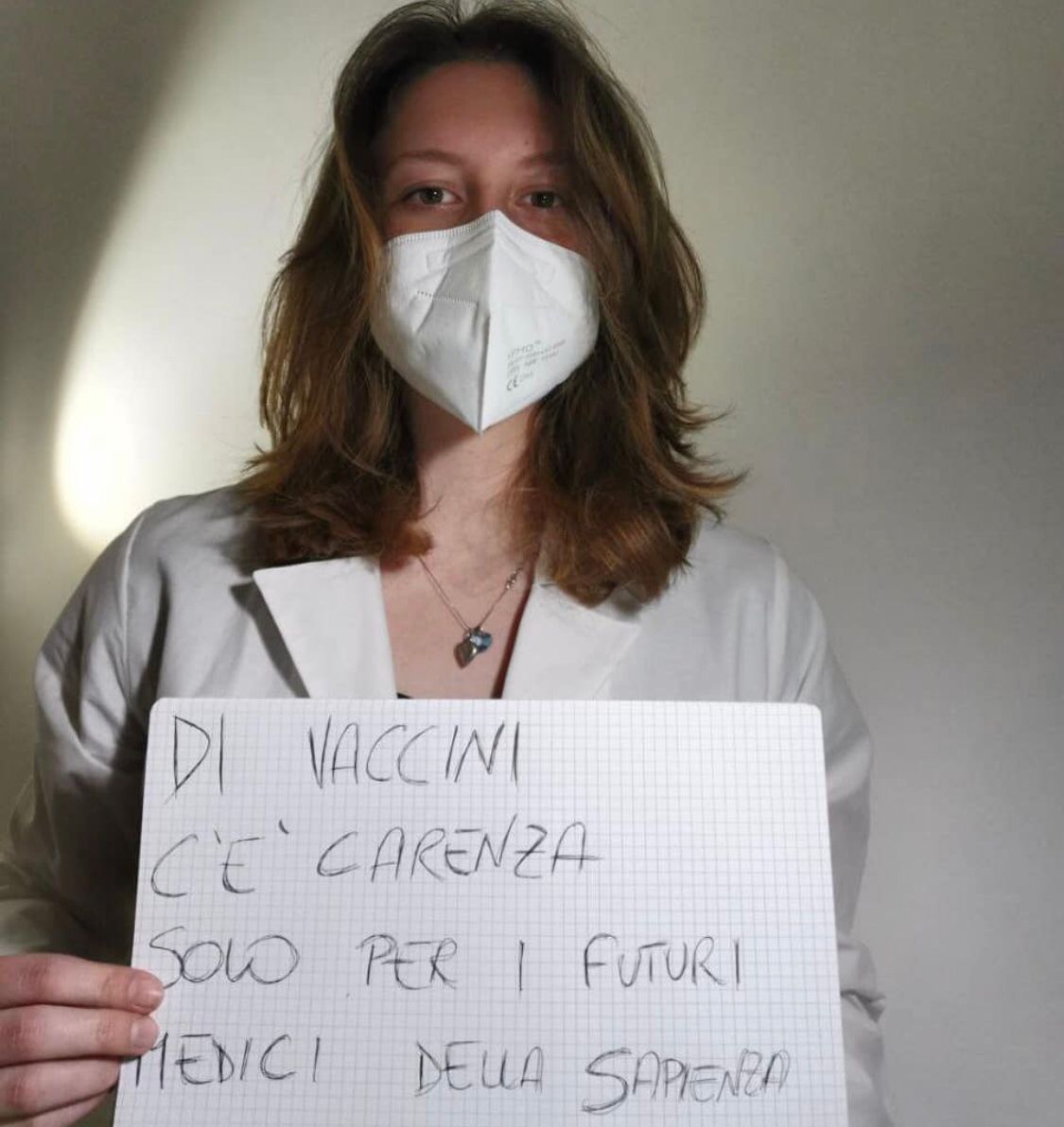 Questa domanda, che in pochi si pongono, è la prova di un comportamento istituzionale illogico e sconsiderato. Le vaccinazioni, per i tirocinanti, sarebbero dovute già iniziare in quanto rientrano nella ‘terza fascia di proprietà’. Eppure loro non sono ancora stati inseriti nel calendario vaccini, seppur per la quarta fascia siano già iniziati. “Di vaccini c’è carenza, solo per i futuri medici della Sapienza” recita il cartello di una giovane studentessa, che lascia davvero poco spazio ai commenti.