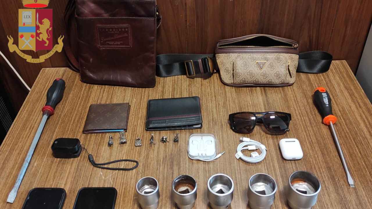 Già da un primo controllo, all’interno dell’utilitaria, sono stati trovati 2 grossi cacciaviti ed altra attrezzatura da meccanico solitamente usata per forzare porte e finestre. Dopodiché, grazie alle successive perquisizioni, sono saltati fuori altri piccoli oggetti, tra cui una coppia di AirPods (tra gli articoli più “gettonati” in questo periodo), alcuni segnaposto in argento ed un saturimetro.