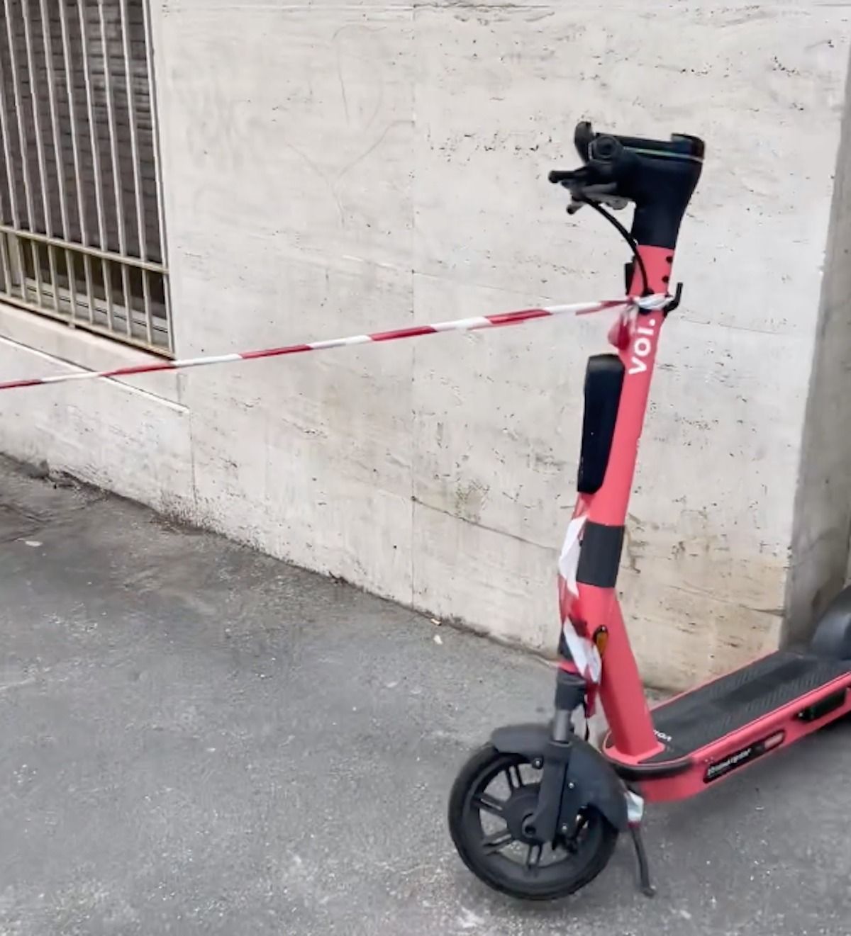 Lavori all’italiana e segnaletiche arrangiate: nastro attaccato a un monopattino