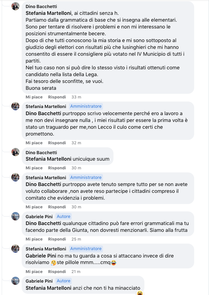 Ha poi preso la parola un’altra cittadina, ricordando la promessa fatta ai cittadini in campagna elettorale di prendersi cura delle scuole entro 20 giorni. “Tra due mesi le scuole chiudono e i giardini ancora sono così, nelle altre scuole”. La donna poi, probabilmente nella fretta, commette un errore grammaticale, scrivendo “hai cittadini”. Si intromette l’assessore Dino Bacchetti che umilia la signora, scrivendo così. “ai cittadini senza h. Partiamo dalla grammatica di base che si insegna alle elementari”. Ma, nel commento precedente, Bacchetti aveva detto che non avrebbe più partecipato alla discussione. “Io no pubblicherò ne commenterò più. Pensavo di interloquire con il comitato di quartiere di Casal Bruciato, mi ritrovo in una sezione della Lega (Nord) con Salvini. Buona fortuna e buon lavoro a tutti”, aveva scritto (commettendo lui stesso degli errori ortografici – no al posto di non, ne al posto di né – che abbiamo volutamente lasciato, per far capire che a volte, per la fretta, si possono commettere…), smentendosi un attimo dopo.