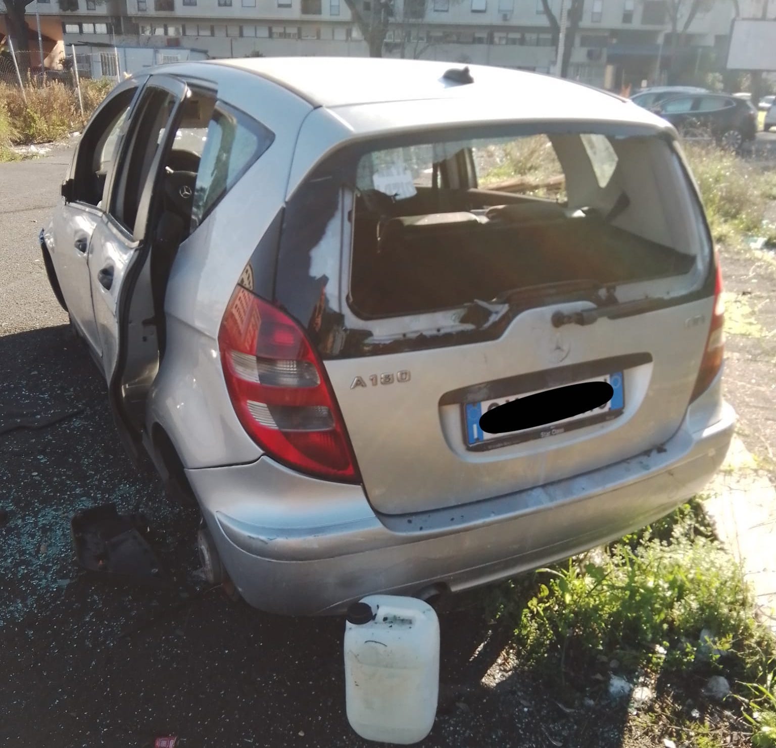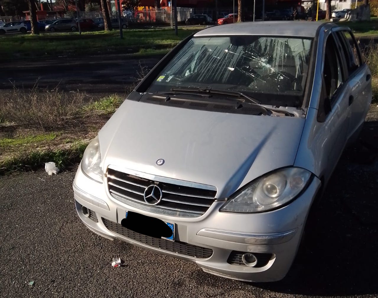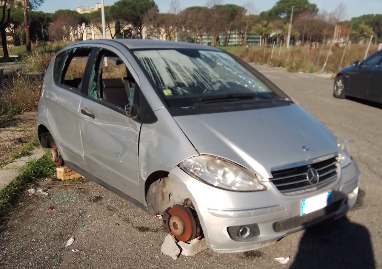 Un’auto, di provenienza quasi certamente furtiva, era infatti pronta per essere bruciata dopo essere stata cannibalizzata. Poco distanti, altre vetture avevano già fatto la stessa sorte. “Ci troviamo in via dell’Archeologia, a Tor Bella Monaca”, spiega Marco Doria. Accanto all’auto, a cui hanno tolto le ruote e altri pezzi, c’è una tanica di benzina”. I vetri della vettura, una Mercedes Classe A, sono tutti frantumati.