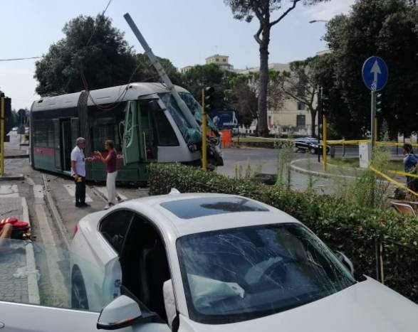 Roma, tram impatta contro un’auto e poi si schianta contro un palo: due feriti (FOTO)