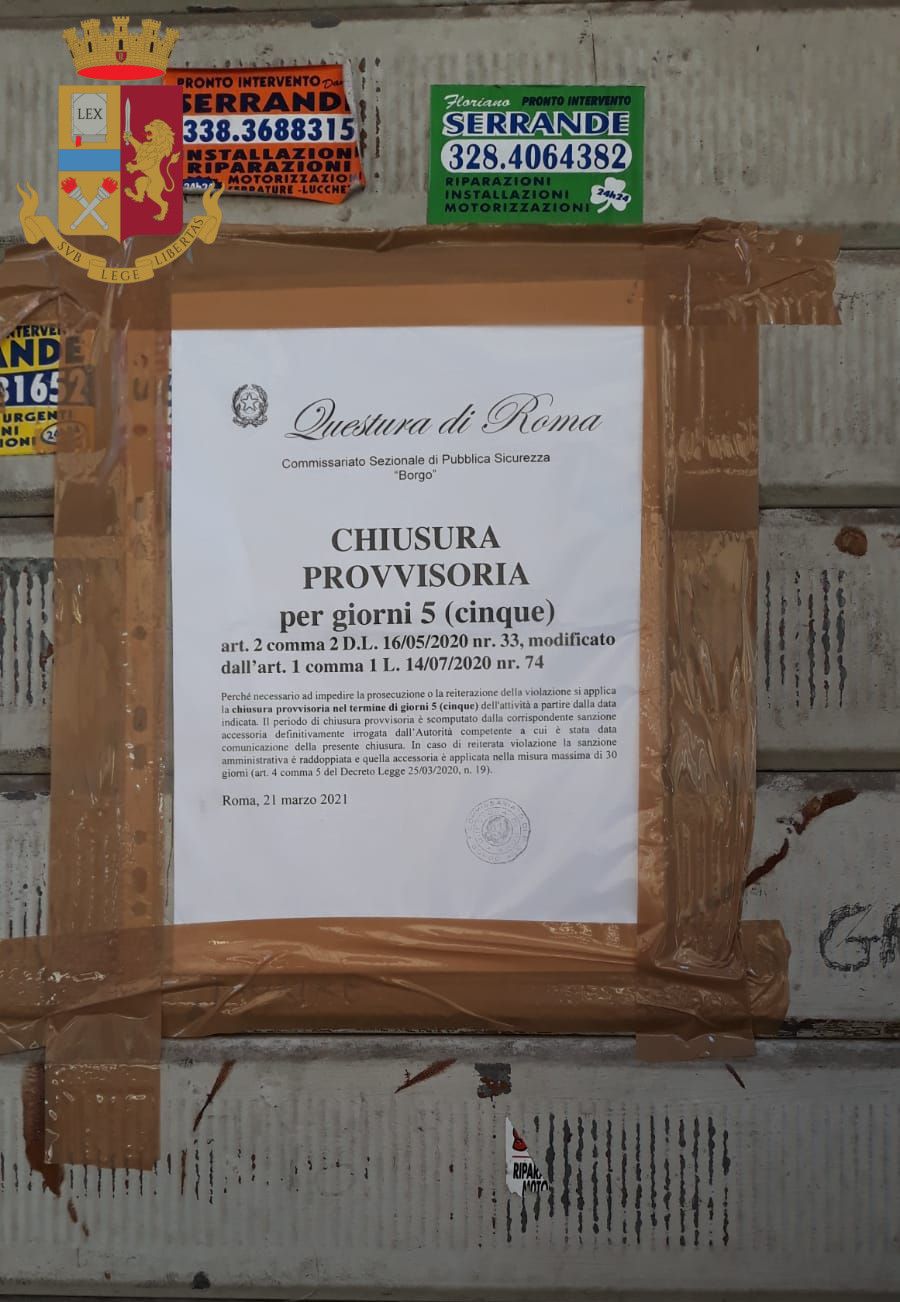 Contattato il figlio del proprietario, responsabile del locale in assenza del padre temporaneamente fuori città, questi si è portato immediatamente sul posto: le 6 persone sono state sanzionate per violazione della vigente normativa Nazionale e Regionale, in materia di spostamenti e attività consentite in relazione all’attuale emergenza Covid 19 mentre il responsabile è stato sanzionato per l’inottemperanza alla normativa che vieta l’apertura al pubblico con conseguente chiusura dell’attività per 5 giorni.