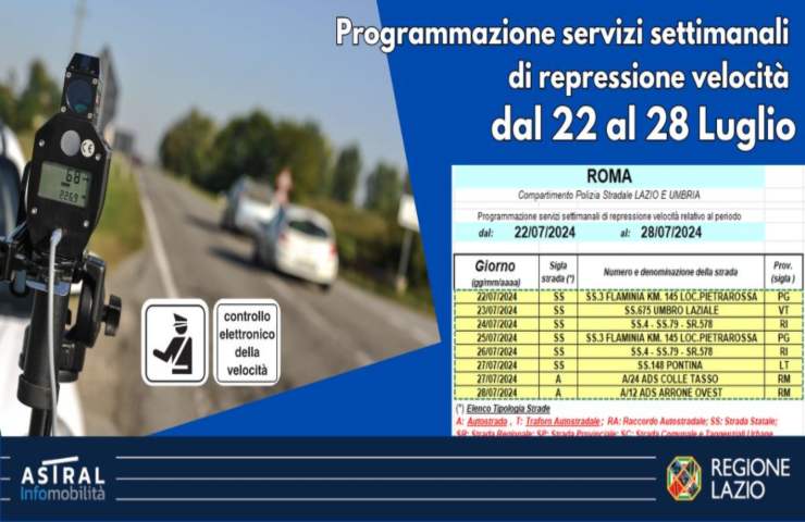 Continuano i controlli settimanali delle forze dell’ordine su strade e autostrade del Lazio. Stretta sull’alta velocità e sui comportamenti errati alla guida: il piano delle postazioni mobili autovelox fino a domenica prossima.