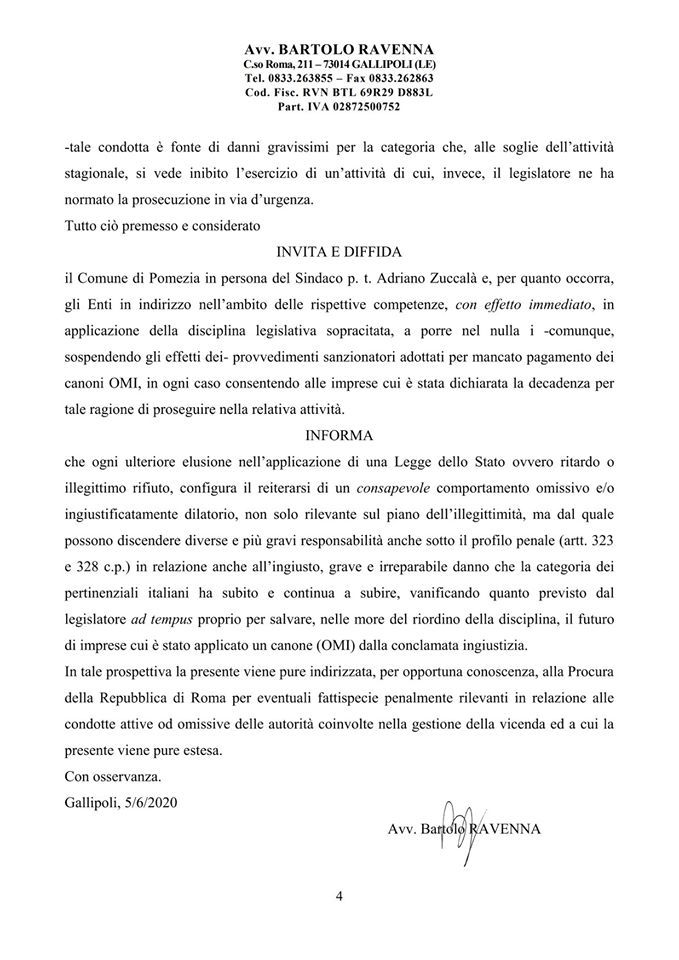 ” ; ’ ( )”, si legge in un post pubblicato dalla stessa associazione. “Il Sindaco di Pomezia convoca Walter Galli, da giorni in sciopero della fame e dei medicinali. Insieme ai funzionari e agli amministratori comunali lo ascolta per quasi 90 minuti, dopodiché comunica alla stampa la conferma del blocco dell’attività. La categoria insorge con l’Avv. Bartolo Ravenna, che chiede al Sindaco l’applicazione della legge con sospensione immediata dei pagamenti e delle decadenze per morosità causa maxi-canoni OMI”. Il tutto viene accompagnato dalla copia della diffida inoltrata a Zuccalà (visibile nelle immagini).