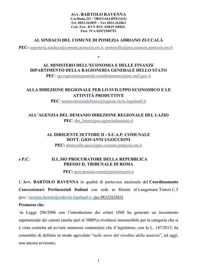 E’ già arrivata, da parte di uno dei titolari degli stabilimenti balneari a cui è stata ritirata la concessione, la prima replica al sindaco di Pomezia Adriano Zuccalà dopo che ieri ogni speranza di trattativa è stata definitivamente abortita. Walter Galli, titolare del “Port Royal”, ha consegnato la documentazione in suo possesso al Coordinamento Concessionari Pertinenziali italiani che, attraverso l’ufficio legale che lo rappresenta, ha immediatamente inviato una diffida al Primo Cittadino e all’amministrazione comunale.
