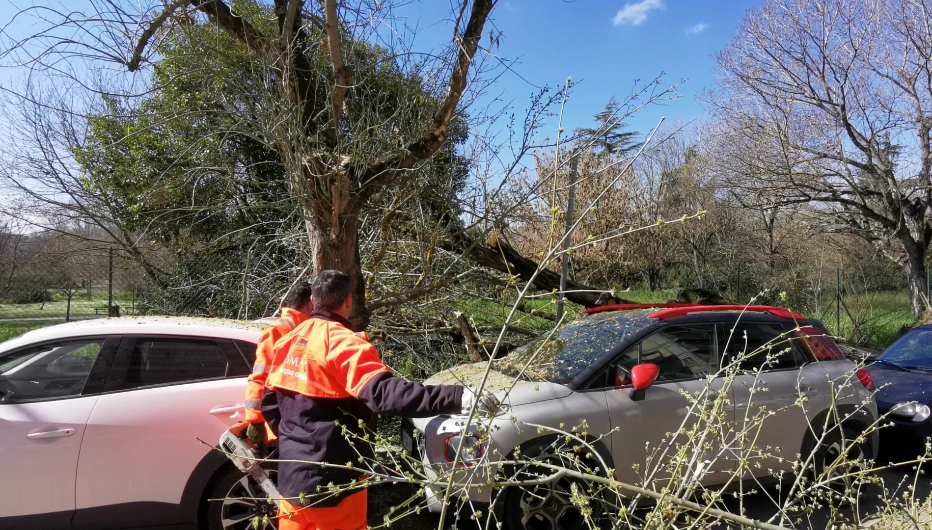 Le tre auto sono state danneggiate, in particolar modo una Fiat Seicento, colpita nella parte posteriore dalla base del tronco dell’albero, incastrata tra lo sportello e il retro dell’auto. Danni anche a una Citroen, colpita sul cofano dai rami dell’albero, mentre la terza vettura, una Madza, è stata colpita nel lunotto posteriore, andato in frantumi, così come il tergicristalli e le luci posteriori, oltre a notevoli danni alla carrozzeria.