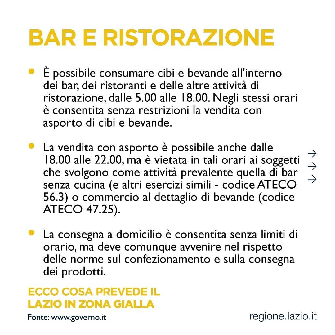 In zona gialla (nel Lazio da lunedì 1 febbraio) bar e ristoranti possono finalmente riaprire al pubblico fino alle 18 (resta il divieto di asporto dopo le 18 per i bar e gli esercizi simili senza cucina, sempre consentite le consegne a domicilio). Sarà possibile, dunque, consumare cibi e bevande all’interno dei bar e dei ristoranti dalle 5.00 alle 18.00 (resta il coprifuoco alle 22). La consegna a domicilio è consentita senza limiti di orario, ma deve avvenire nel rispetto delle norme sul confezionamento e sulla consegna dei prodotti.