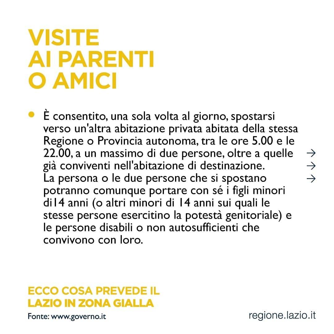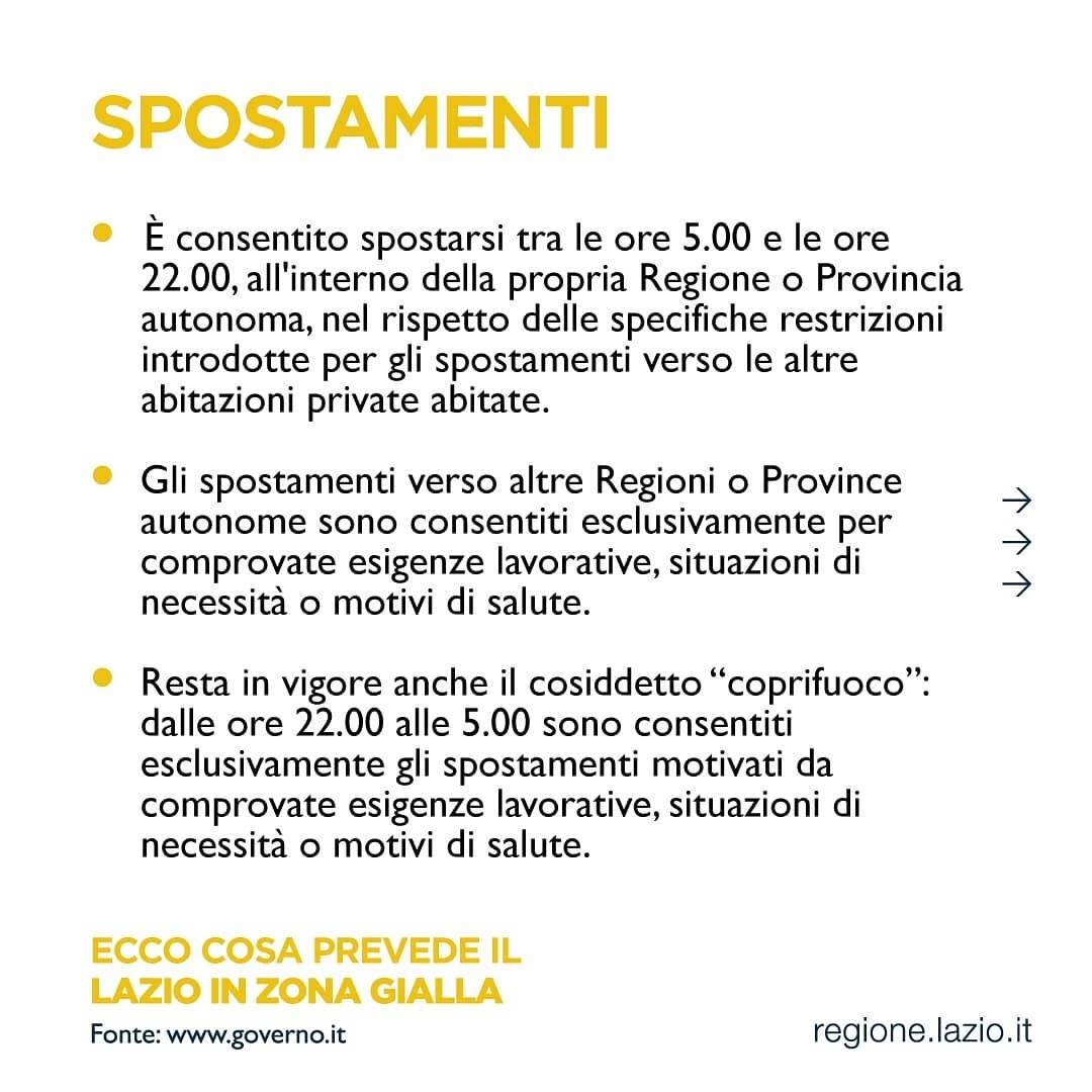 Da lunedì 1 febbraio il Lazio torna in zona gialla dopo due settimane: ultimi giorni, quindi, in fascia arancione per poi iniziare la prima settimana di febbraio in un’altra “classificazione”. Per quanto riguarda gli spostamenti, è consentito spostarsi tra le ore 5.00 e le ore 22, all’interno della propria Regione, a patto che a muoversi sia 2 persone non conviventi e verso una sola abitazione privata, una sola volta al giorno. La persona o le due persone che si spostano potranno portare con sé i figli minori di 14 anni, le persone disabili o non autosufficienti che convivono con loro. Gli spostamenti verso altre Regioni (anche se in zona gialla) sono vietati fino al 15 febbraio, consentiti solo per comprovate esigenze. Resta in vigore il coprifuoco alle 22.